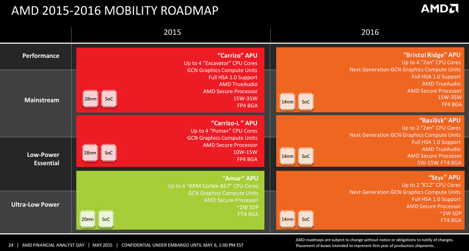 Different cores: x86 Puma+ (Amur) or ARM Cortex-A57 (Nolan). Based on AMD’s mobility roadmap for 2015 – 2016, which was published on Wednesday, AMD no longer plans to offer “Nolan” APU.