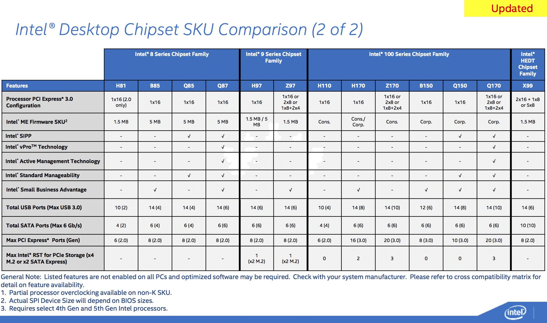 The family of “Skylake”-supporting Intel 100-series chipsets will include six models: Intel Z170, Intel H170, Intel Q170, Intel Q150, Intel B150 and Intel H110, reports Chinese VR-Zone. Traditionally, different core-logic sets will be aimed at different market segments. The only SKU that will support overclocking will be the Z170. Another core-logic – the Q170 – will support corporate-oriented technologies like vPro, active management, small business advantage and some other.