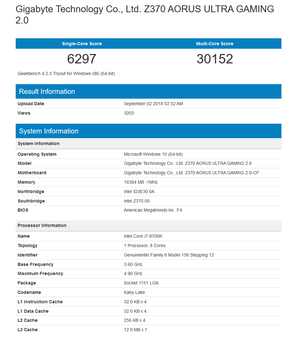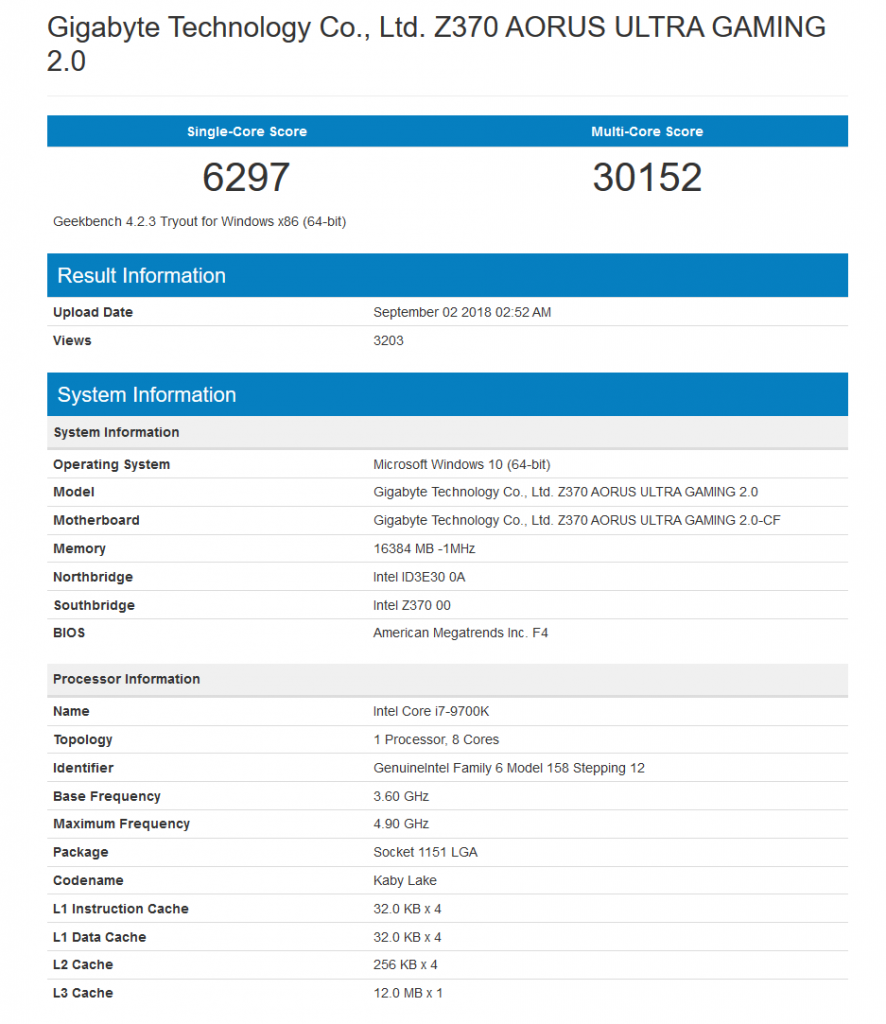 Earlier this week, Intel’s unreleased i7-9700K made its way onto the Geekbench database, via PCGamesN, with the 8-core/8-thread CPU showing a score of 6,297 on single-core performance and 30,152 on multi-core. This is a step up from the respective 5,508 and 25,034 scores achieved by last generation’s i7-8700K, which retained single-core performance over AMD’s Ryzen 7 2700X but was outdone in multi-core with Team Red attaining a score of 26,011.