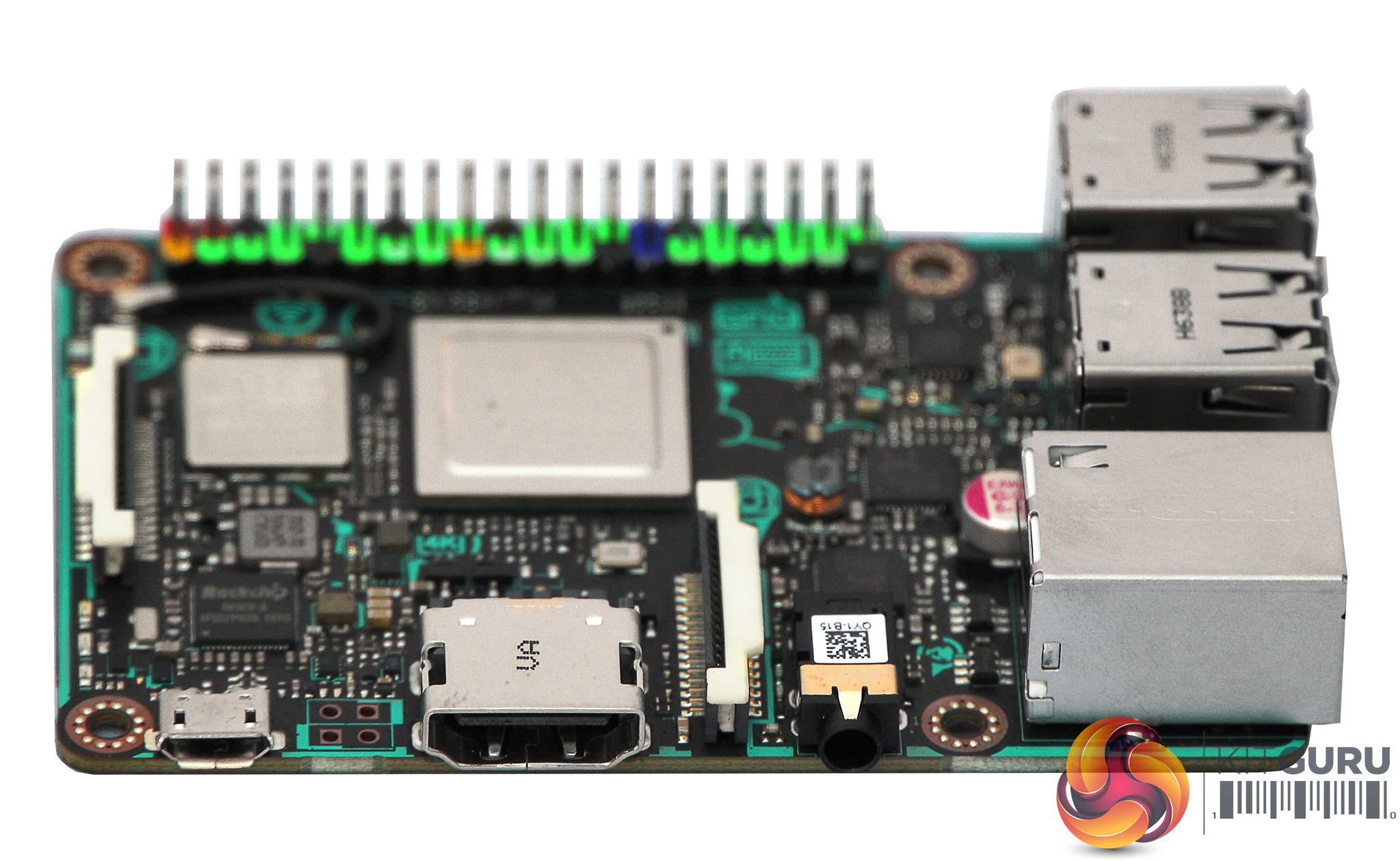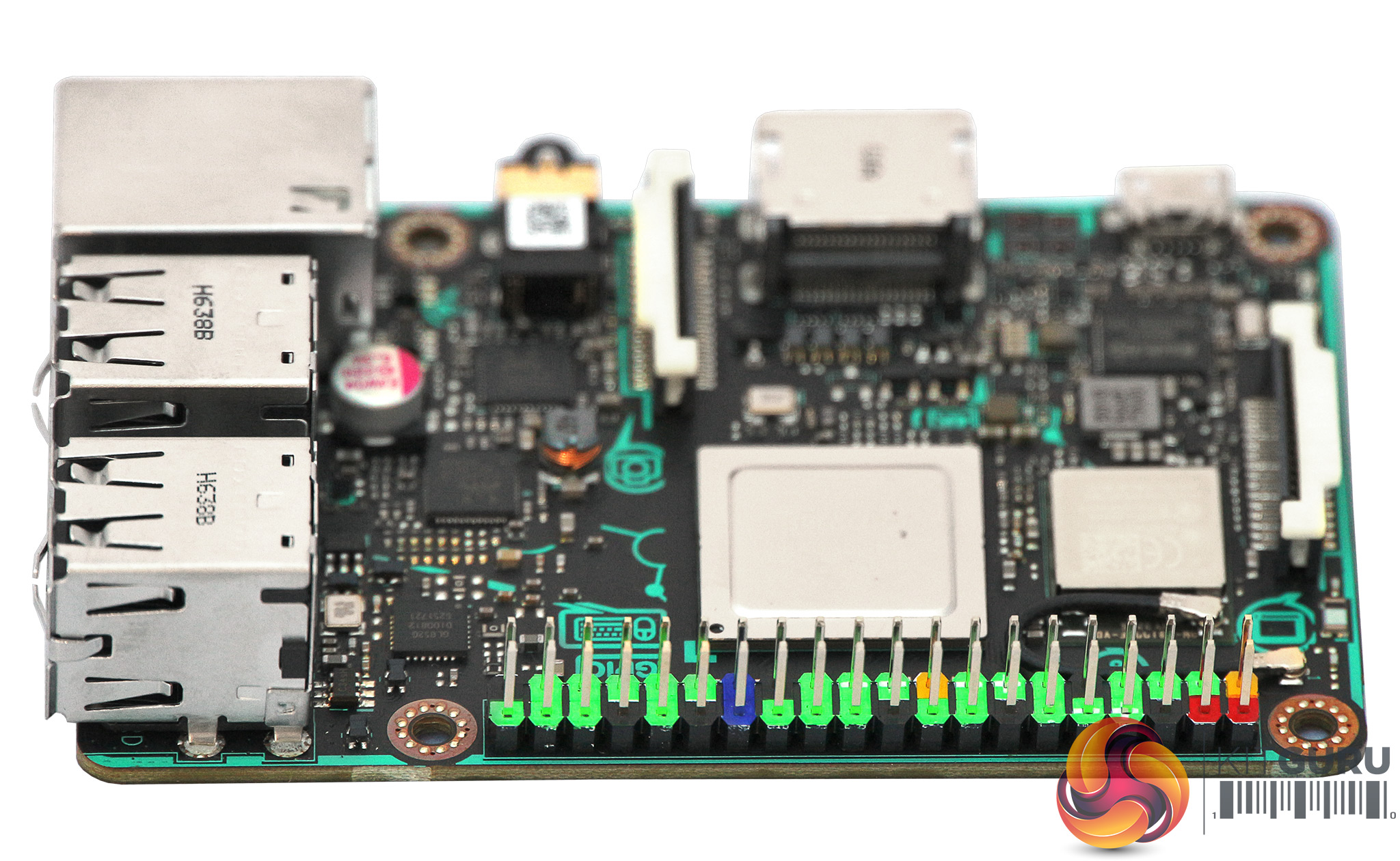 Just like a Raspberry Pi 3, one end sports the four USB 2.0 ports and LAN, although the latter in this case is Gigabit Ethernet. Nestling between the USB and LAN are bare connectors for S/PDIF digital audio, although you will have to solder your own wires to these. The other end is where the 15-pin DSI header for serial-connected displays resides.