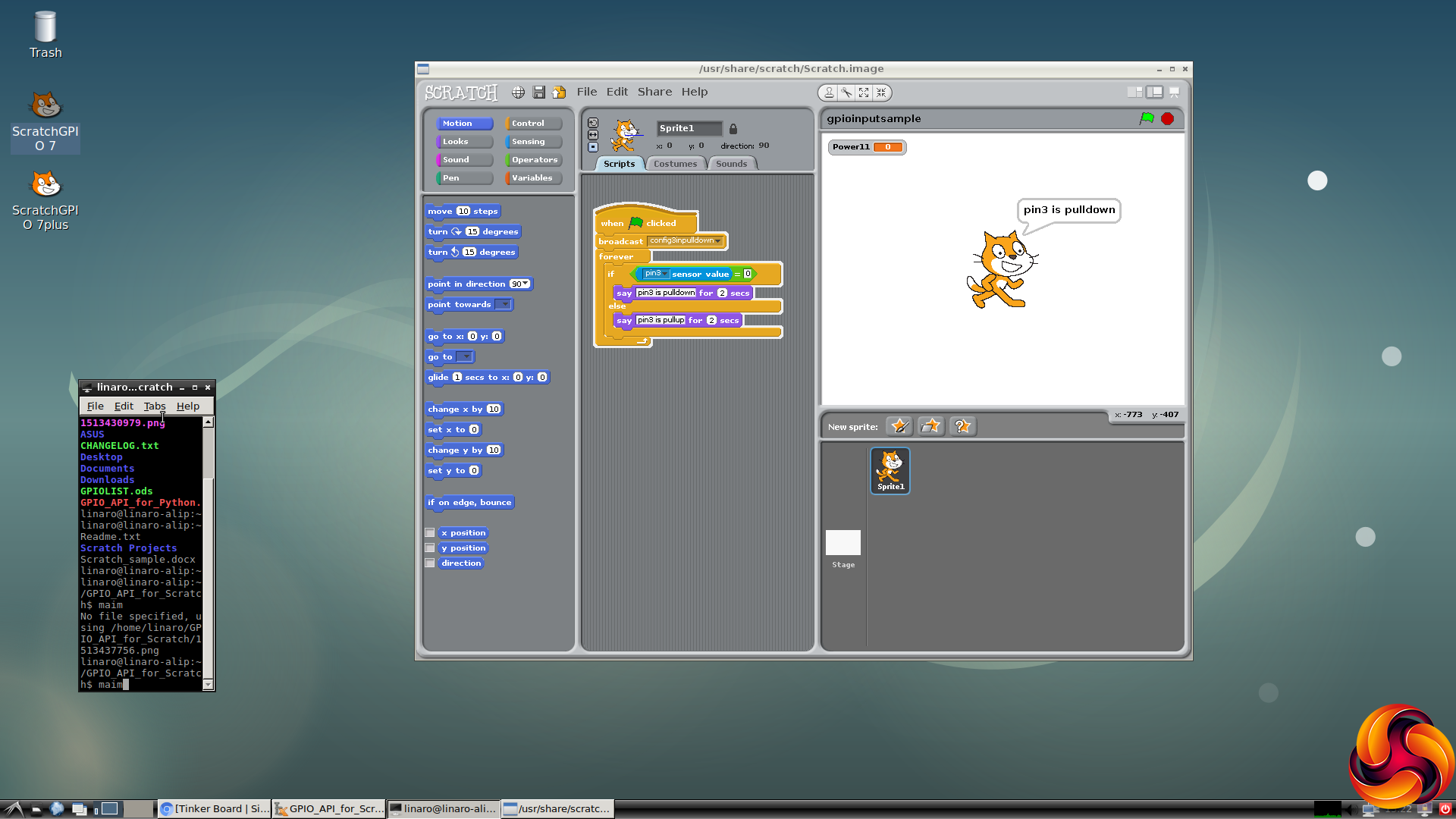 ASUS now also provides installable APIs for using the GPIO header with C, Python, and Scratch. These are all for use with the Debian OS. You install the Python and C APIs via the command line, with full instructions on ASUS's website. The Scratch API needs to be downloaded and unzipped, too, but you have to figure it out for yourself. You then use a setup command to install two sample projects that appear on the desktop and perform a couple of simple input and output operations via the GPIO header.