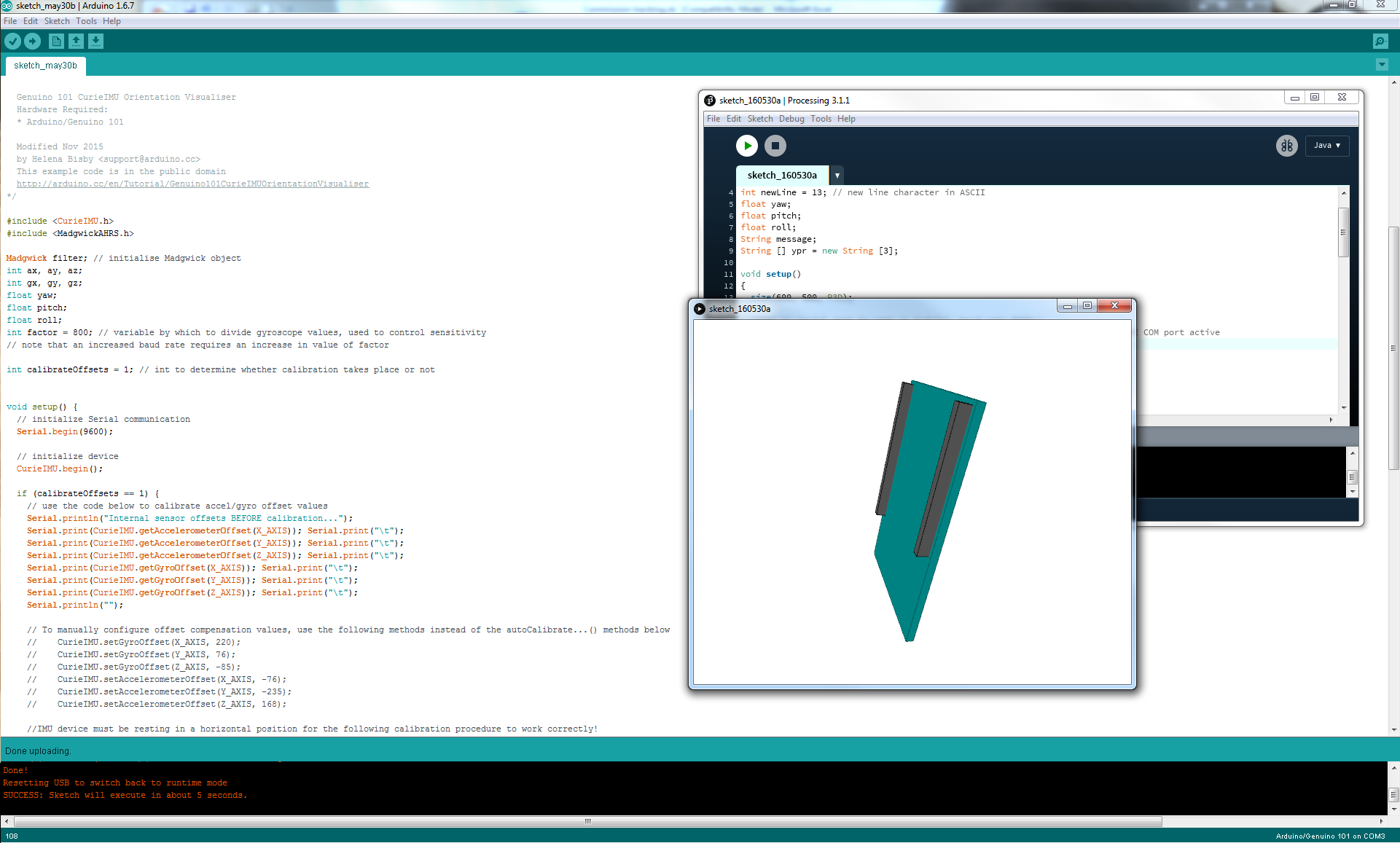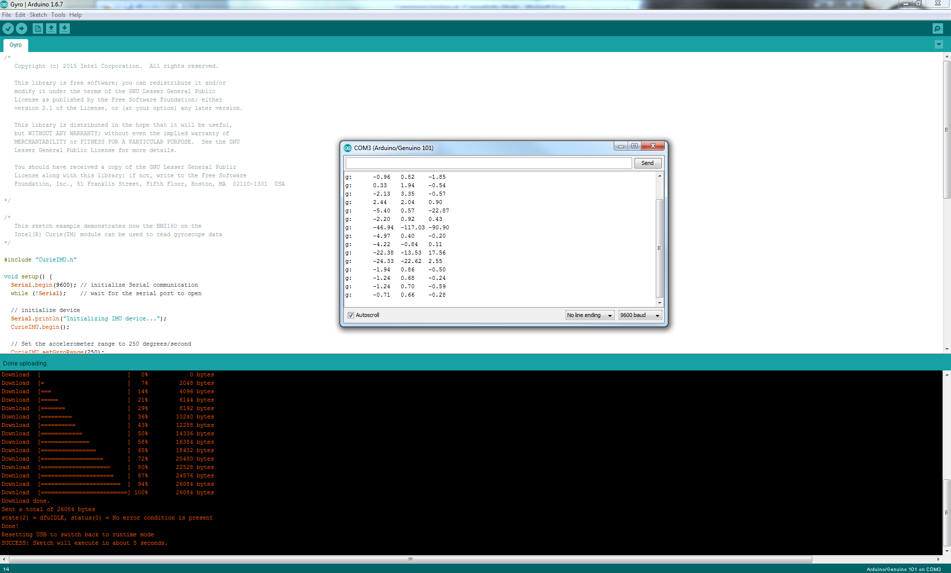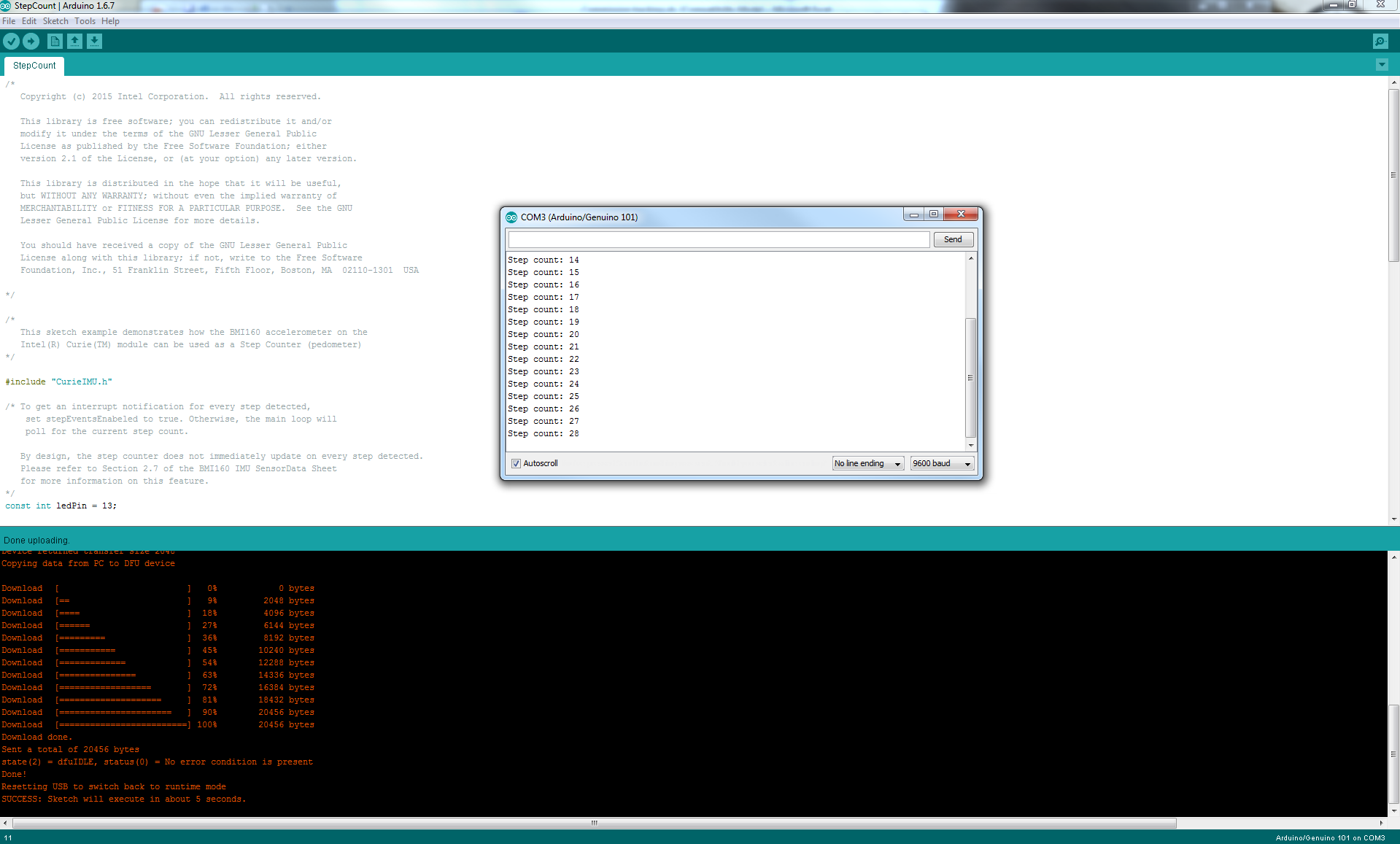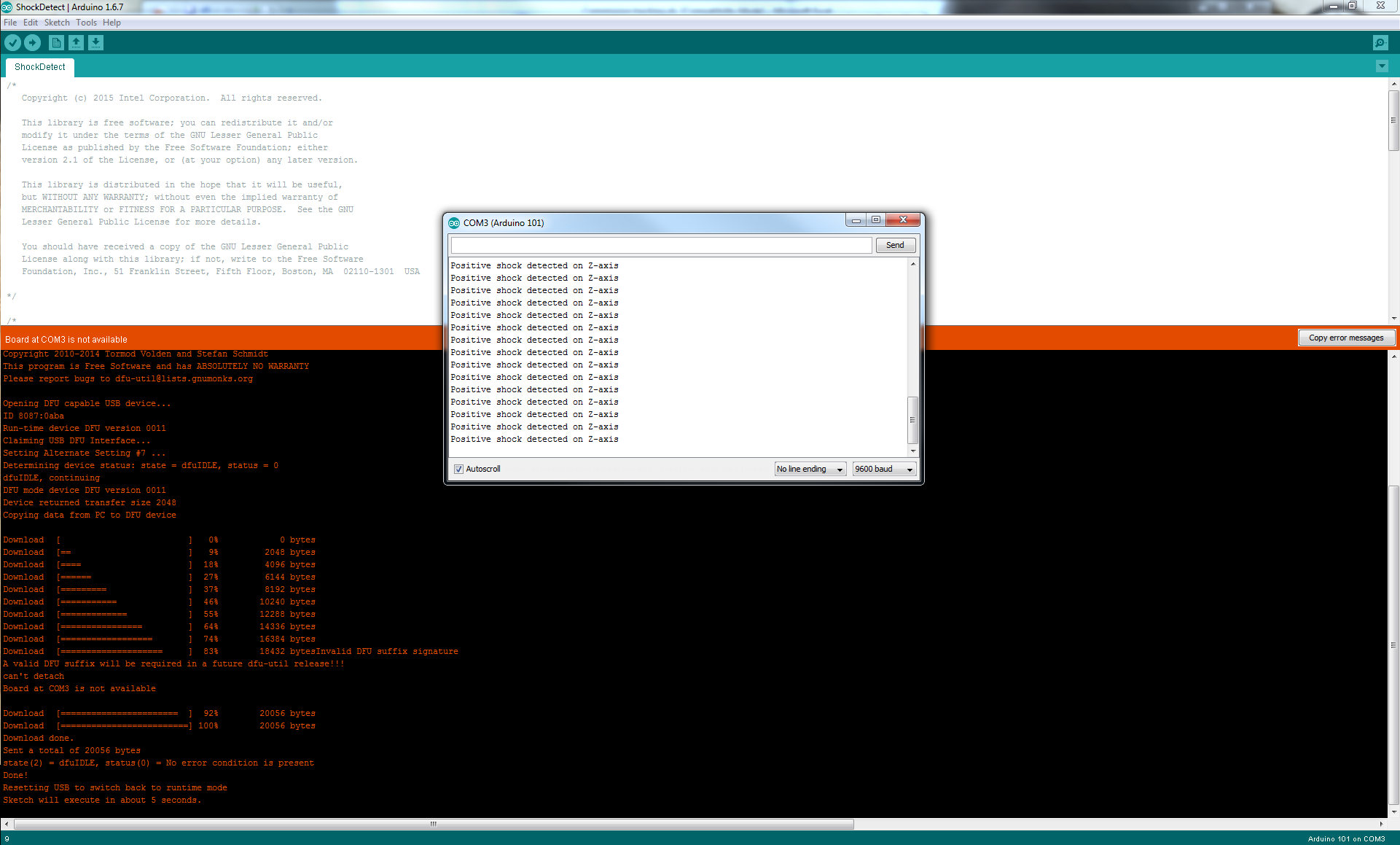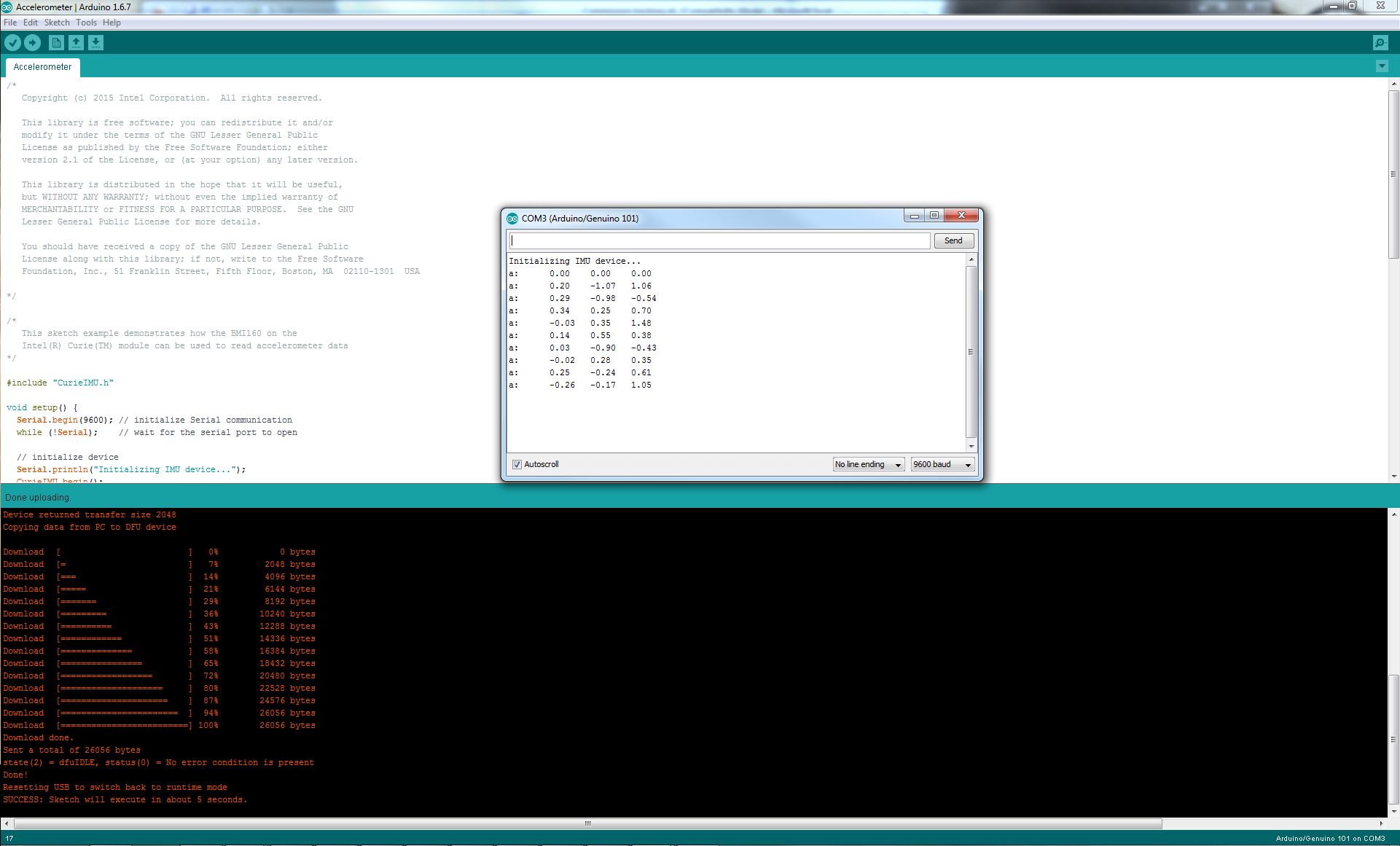 The first bit of code we tried was testing the use of the accelerometer as a motion-detection device. The code basically writes a message back that can be read via the USB port acting as a virtual serial port (which is also how you upload code to the device). If you then jog the Genuino 101, messages will start to appear showing which axis is detecting motion.