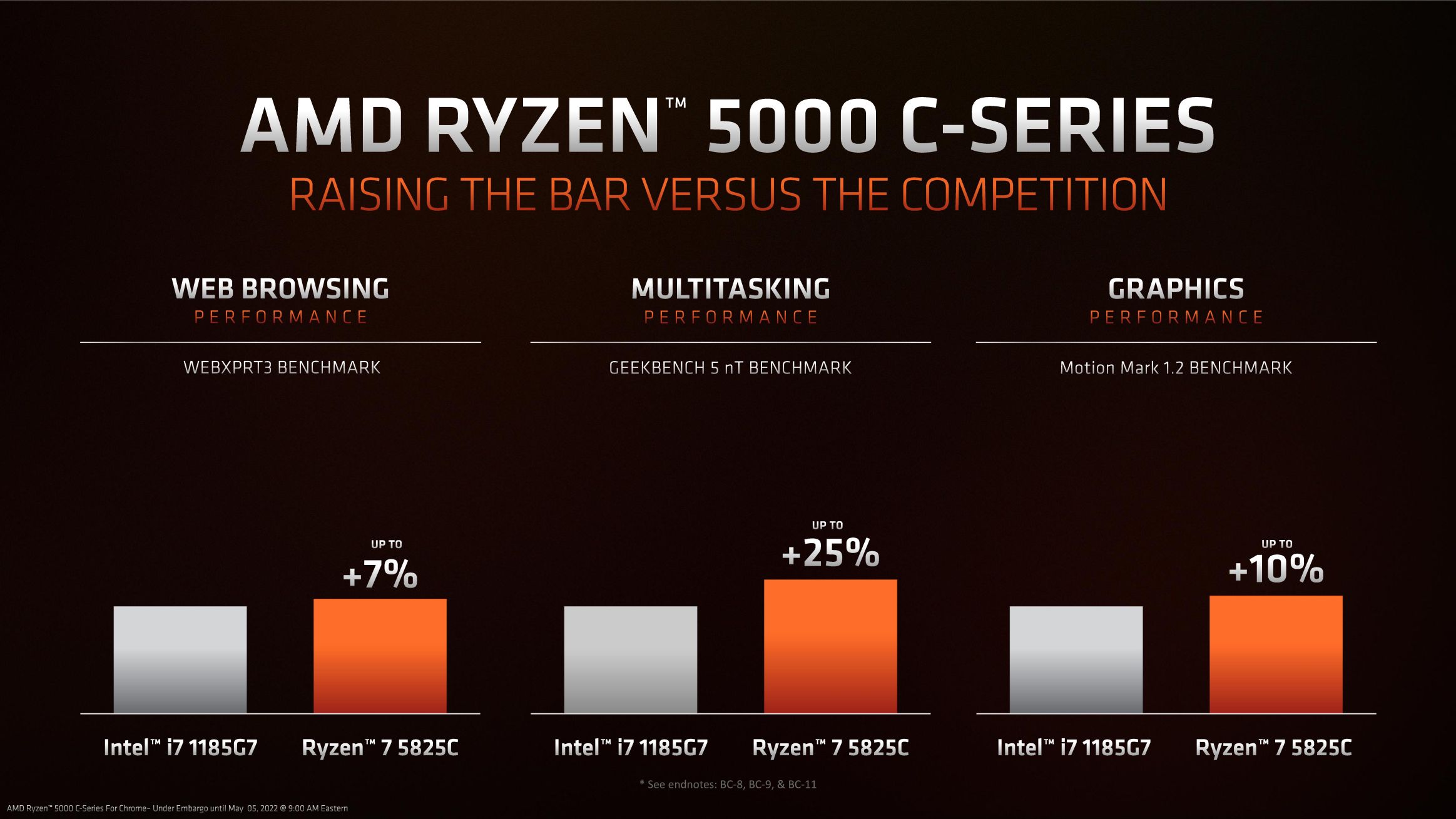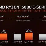 AMD also compared its flagship Ryzen 5000C APU, an 8C/16T chip with a maximum clock of 4.5GHz and an 8-core Vega GPU that boosts up to 1.8GHz, with the Core i7-1185G7. Here, the Ryzen chip showed better web browsing (up to 7%) and multitasking performance (up to 25%), as well as faster graphics (up to 10%).