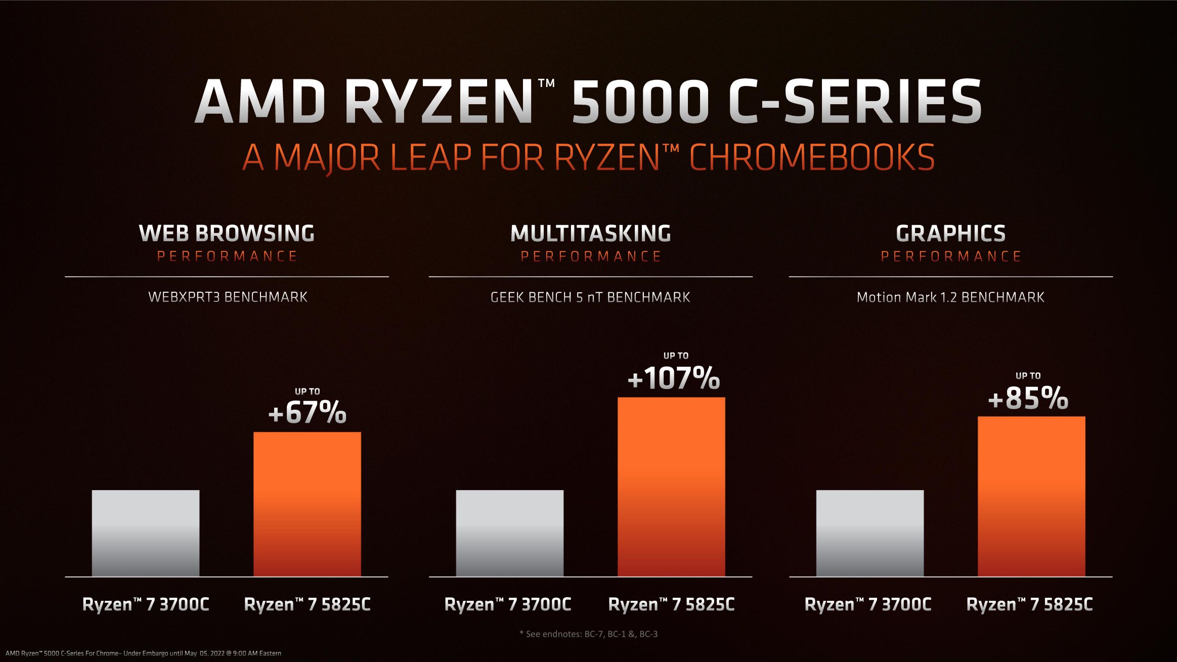 Designed to deliver at least 8 hours of battery life and the highest core count for Chromebook devices, the new Ryzen 5000C chips bring considerable improvements over their predecessors, including Wi-Fi 6E and Bluetooth 5.2. Offering up to 67% more web browsing performance, up to 107% more multitasking performance, and up to 85% more graphics performance, these new APUs alone might be enough reason to upgrade your Chromebook.