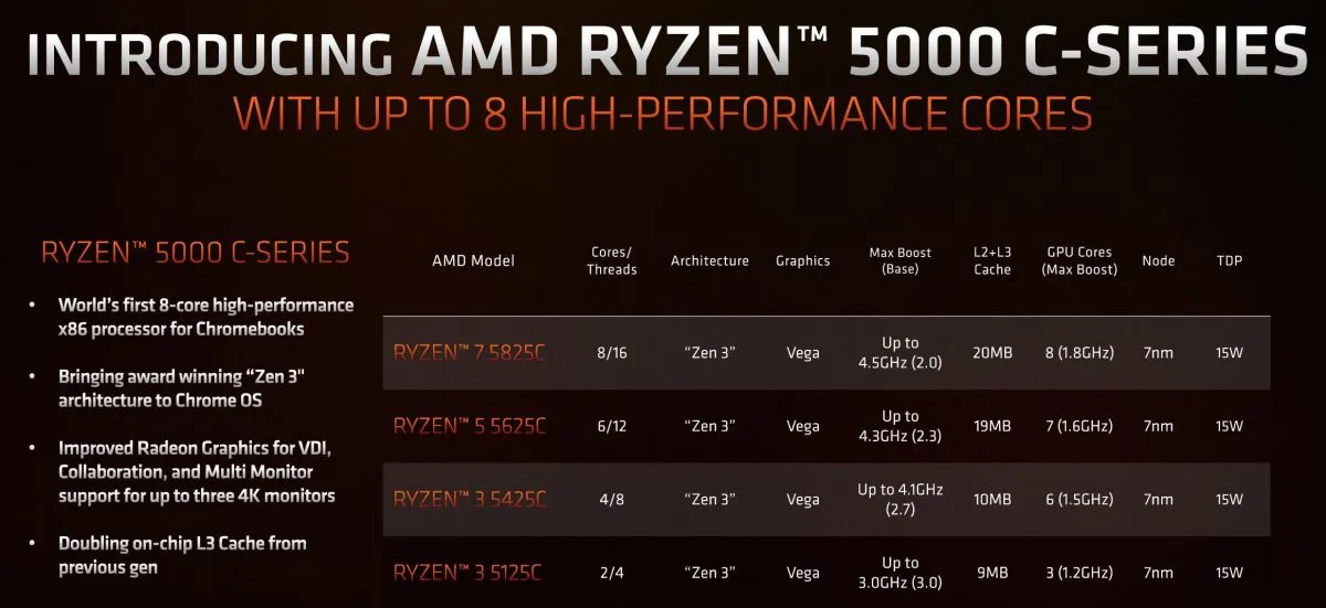Expect to see a new wave of Chromebooks coming. AMD has just announced the new Ryzen 5000C APUs for Google's ChromeOS-based laptops, featuring a 15W TDP and up to eight Zen 3 cores.