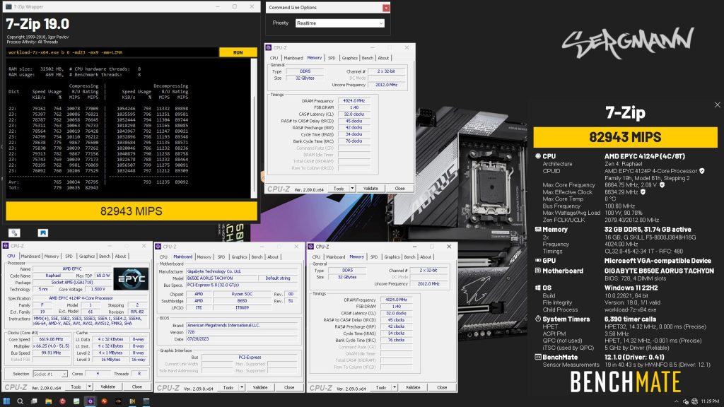 Overclockers have submitted several test runs of this CPU on HWBot (via HXL). The fastest EPYC 4124P (achieved by sergmann) was clocked at 6.7 GHz, running on a Gigabyte Aorus B650E Tachyon and DDR5-8000 memory. With this overclock, we saw the EPYC 4124P scoring an impressive 82,943 MIPS, making it the highest 4-core score on this benchmark.