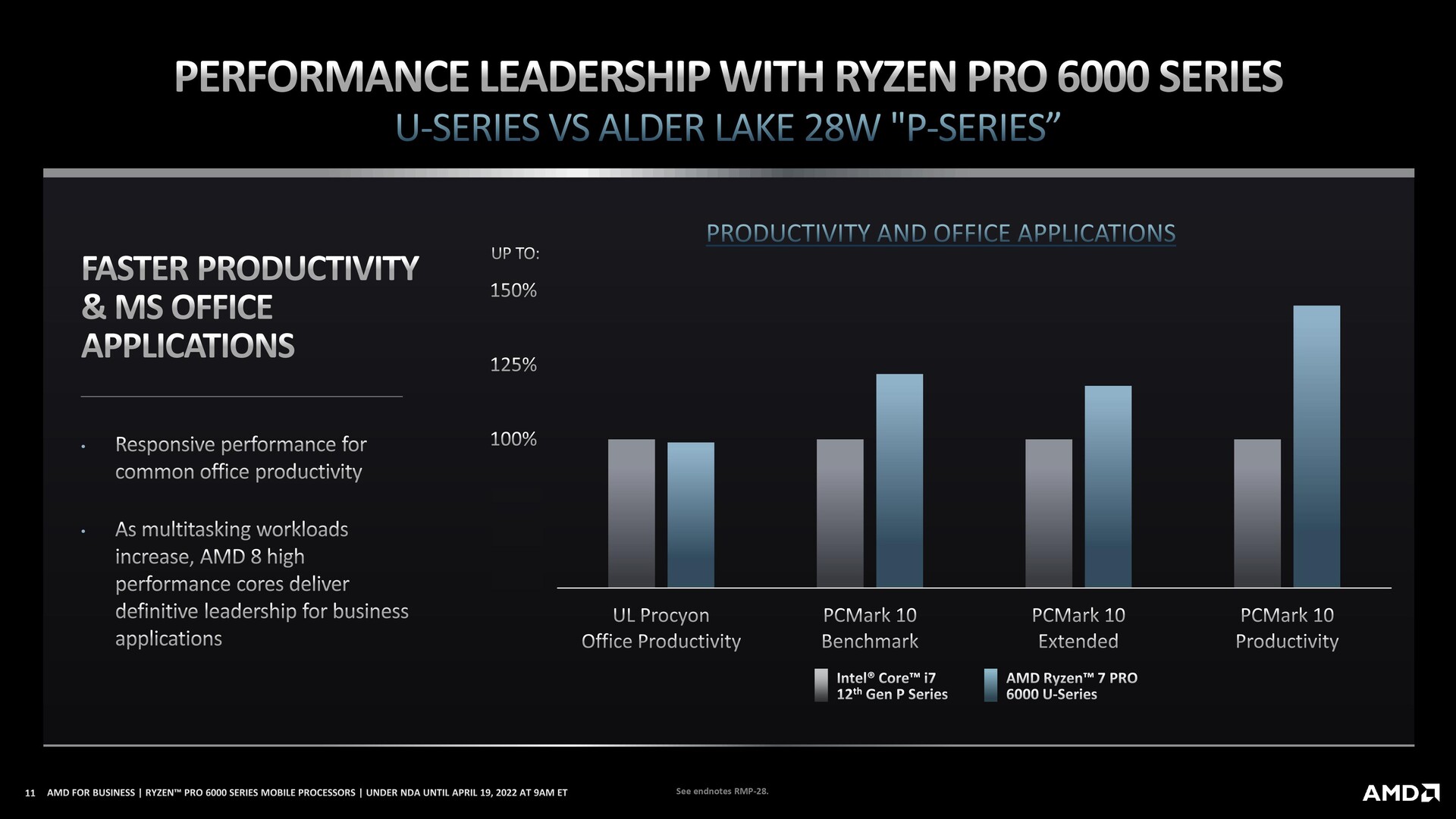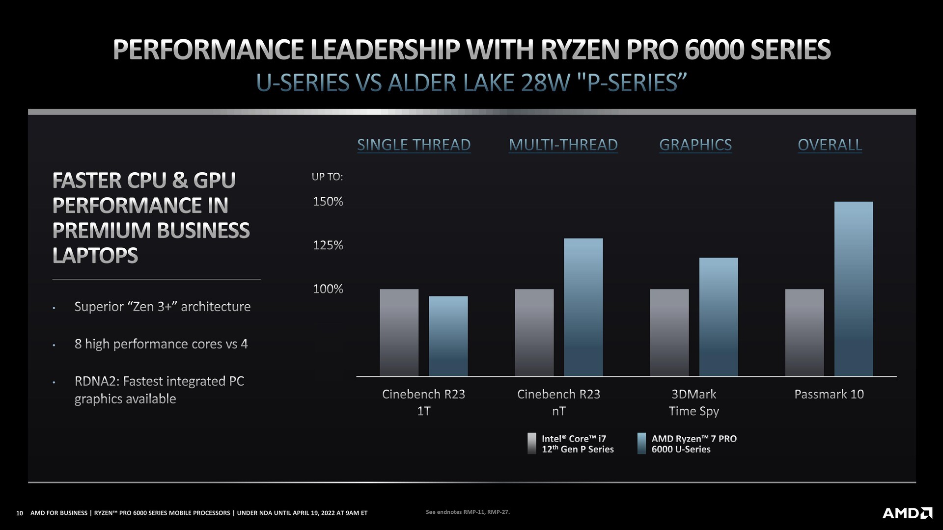 AMD Ryzen Pro 6000 series chips lose to the competition in single-thread tests. However, it's in multi-threaded scenarios and graphics where AMD's new business-oriented chips shine, offering up to 15% more performance in productivity tasks.