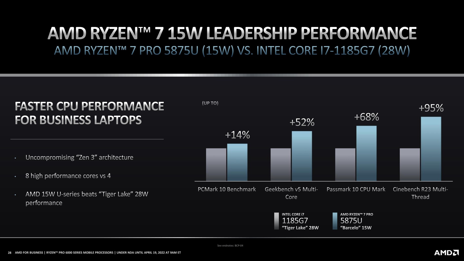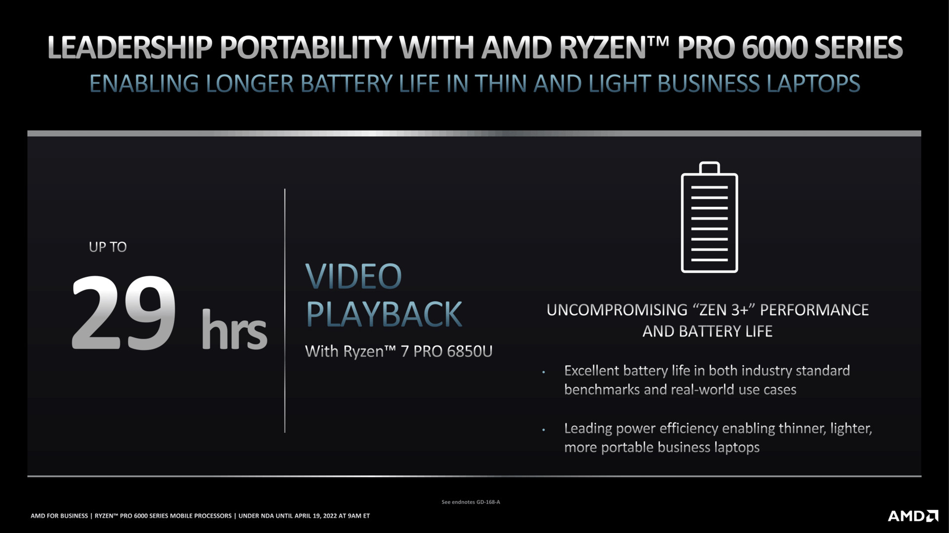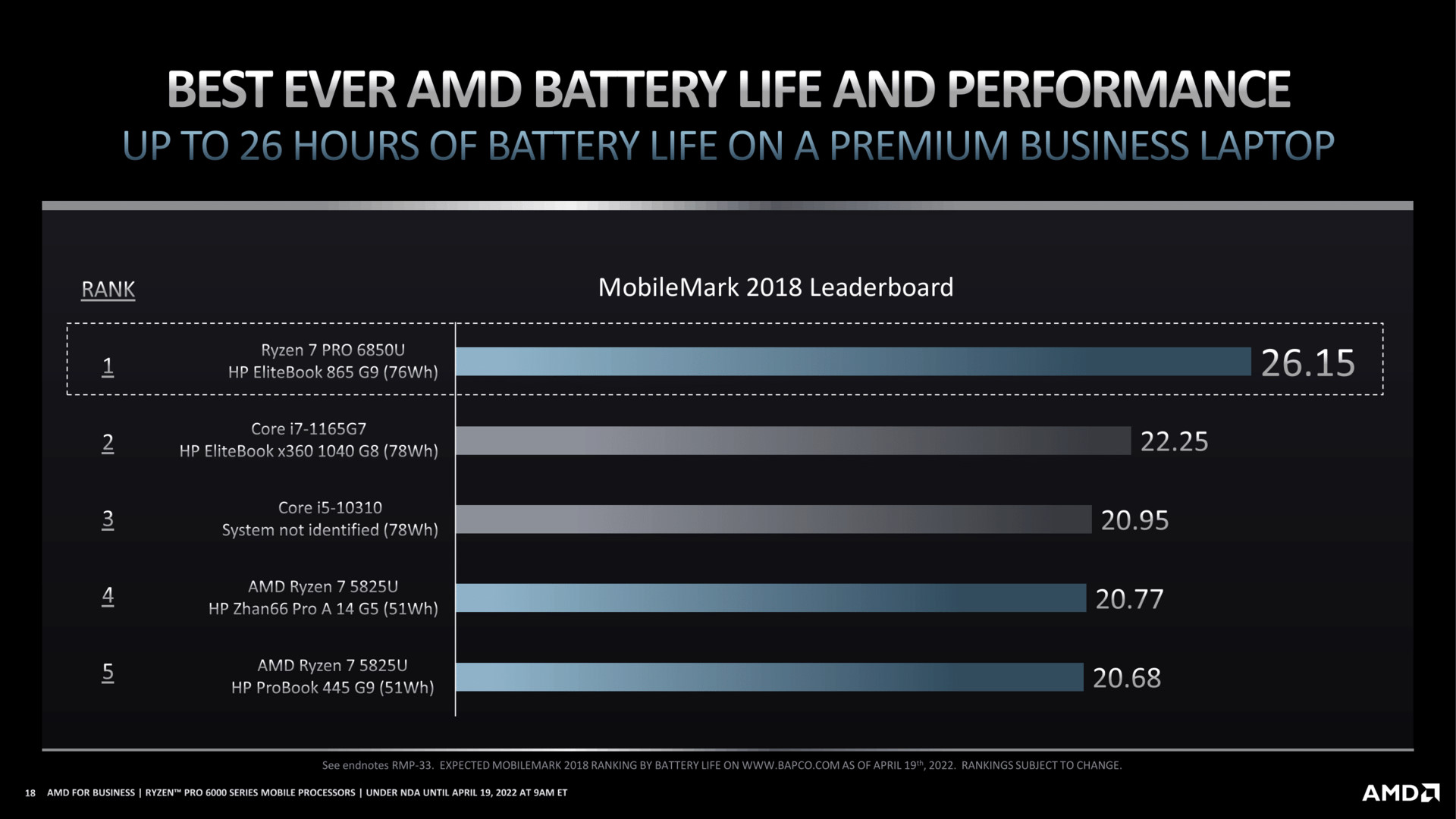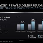 According to the slides, the new laptops can provide up to 29hrs of continuous video playback on battery. In addition, the new chips outperformed Intel's Tiger Lake and Comet Lake mobile chips in MobileMark 2018 battery life test by 4/5 hours and AMD Ryzen 5×25 series APUs by around five and a half hours.