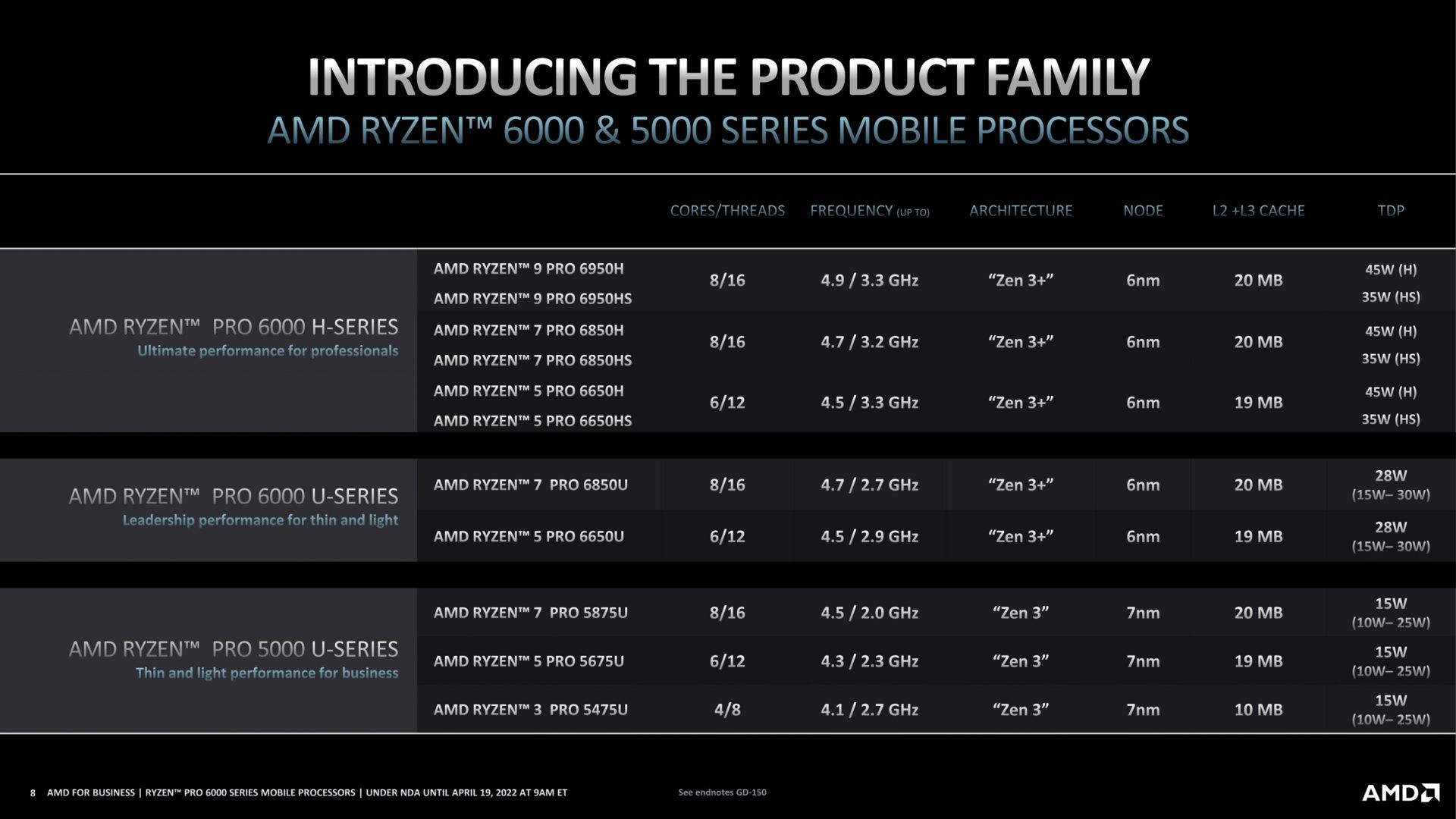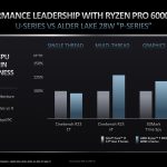 The Ryzen Pro 6000 series line-up is divided into two segments: the Pro 6000 H-series with 35W (HS) and 45W (H) TDPs and the Pro 6000 U-series with a 28W TDP. Specification-wise, they're like their non-Pro counterparts (for example, 6900H to 6950H). Separately, AMD is also launching the new Pro 5000-U series, sharing the same specs as their respective non-Pro equivalents (5825U, 5625U, and 5425U).