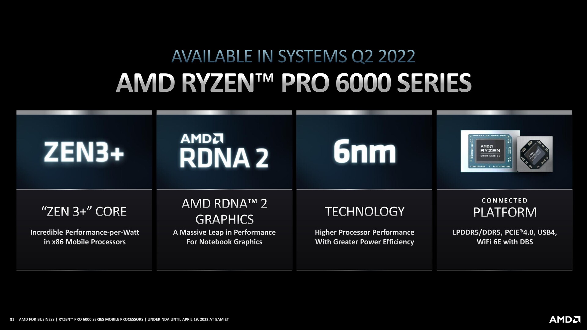 AMD's new Ryzen Pro 6000 laptop chips are based on the Zen3+ architecture (6nm), featuring up to 8 cores and 16 threads. Clock speeds go as high as 4.9GHz, depending on the CPU, offering up to 1.3x the performance of Ryzen Pro 5000 series chips. For the integrated graphics, we have an RDNA 2-based solution promised to deliver up to twice the performance of the previous-gen Vega iGPU.