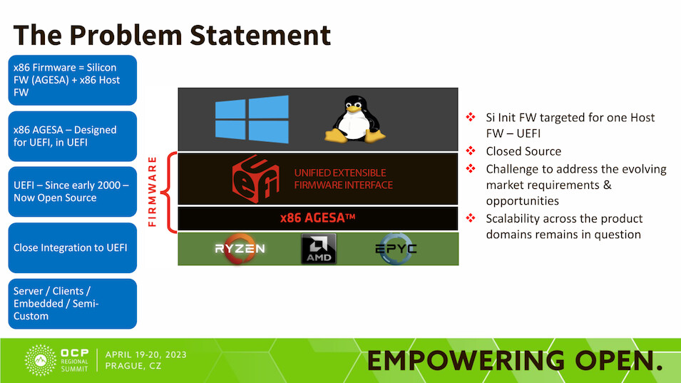 During the OCP Regional Summit, AMD revealed its plans to replace the AMD Generic Encapsulated Software Architecture (AGESA) with an open-source solution called Open-Source Silicon Initialization Library (openSIL). This is expected to happen by 2026 and will gradually cover AMD's entire product stack, including Ryzen and EPYC processors.