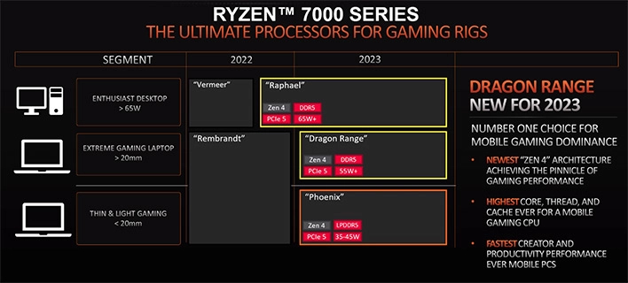 AMD shared a slide where we can see the Zen 4-based Raphael chips are slated for later this year, followed by Dragon Range and Phoenix in early 2023. As AMD confirmed in the past, the Raphael chips will support DDR5 and PCIe 5.0 and come with +65W TDPs, succeeding the Ryzen “Vermeer” desktop series as the next mainstream platform.