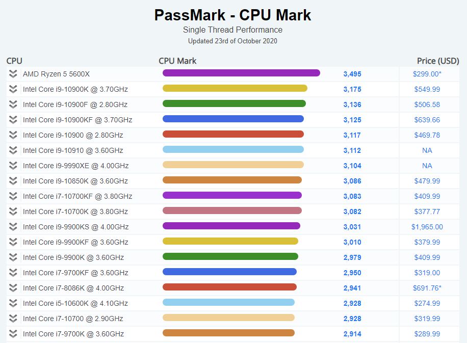 AMD has risen to the top of the PassMark single-threaded benchmark chart. The new chart puts the Ryzen 5 5600X at the very top, beating out plenty of Intel Core i9 and Core i7 SKUs along the way.