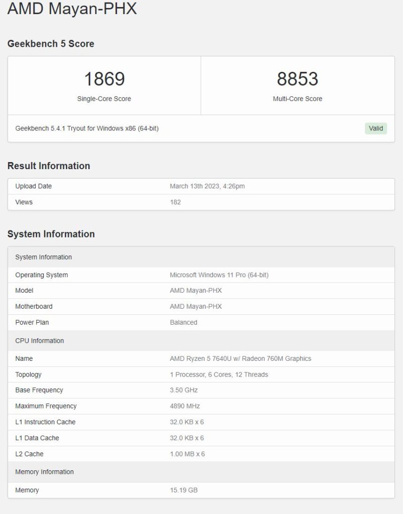 The system information gives us some insights about the 6C/12T processor, which is shown as featuring a Radeon 760M iGPU. The CPU's base frequency is 3.5GHz, but the benchmark registered a maximum frequency of 4.9GHz. In the single-core benchmark, the CPU scored 1,869 points. In the multi-core test, it got 8,853 points.