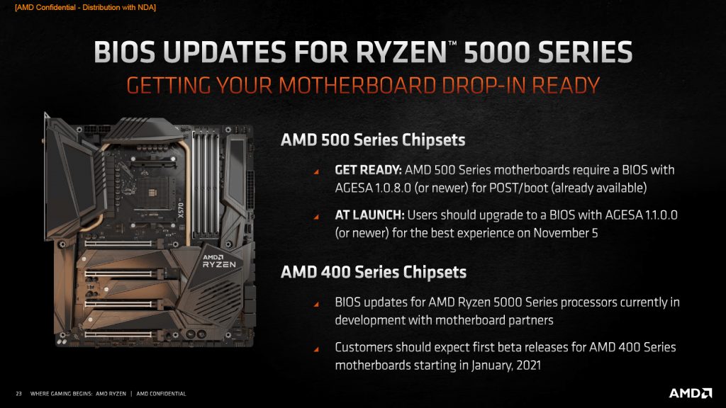 Selected 400-series motherboards will receive Zen 3 support, but the Beta firmware should only arrive in January 2021. If a user wants to build a PC using the Ryzen 5000 processors at launch, the only option will be to use a 500-series motherboard. Only these motherboards will fulfil all the requirements for the Ryzen 5000 processors as they are the only to have a BIOS update featuring the AGESA Combo-AM4 v2 1.0.8.x firmware, the minimum AGESA version for the Ryzen 5000 series.