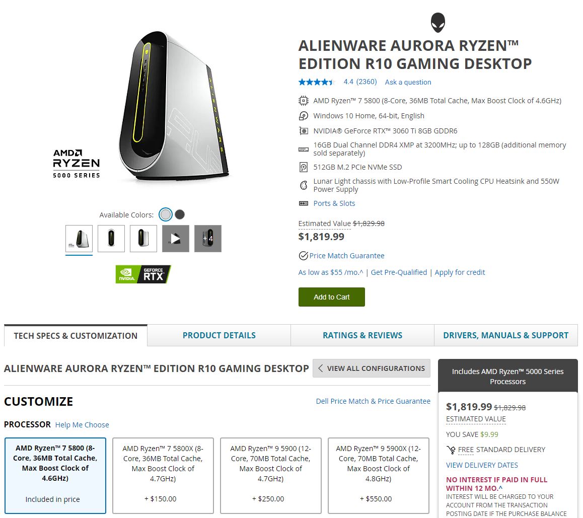 The Dell listing (via Wccftech) shows that you can now order an Alienware Aurora Ryzen Edition R10 gaming PC with either the Ryzen 7 5800 or the Ryzen 9 5900. The Ryzen 7 5800 is the base option, which is $150 cheaper than its X variant. The Ryzen 9 5900 costs $250 more than the Ryzen 7 5800, but it's $300 cheaper than the Ryzen 9 5900X.