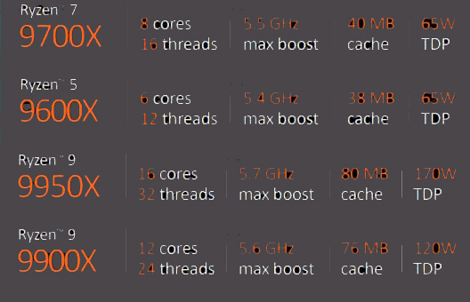 Moving down the line-up, the Ryzen 7 9700X will offer 8 cores and 16 threads, capable of reaching clock speeds of up to 5.5GHz, all within a 65W TDP and 40MB of cache. Similarly, the Ryzen 5 9600X, a 6-core variant with 12 threads, is expected to hit clock speeds of 5.4GHz while having the same 65W TDP.