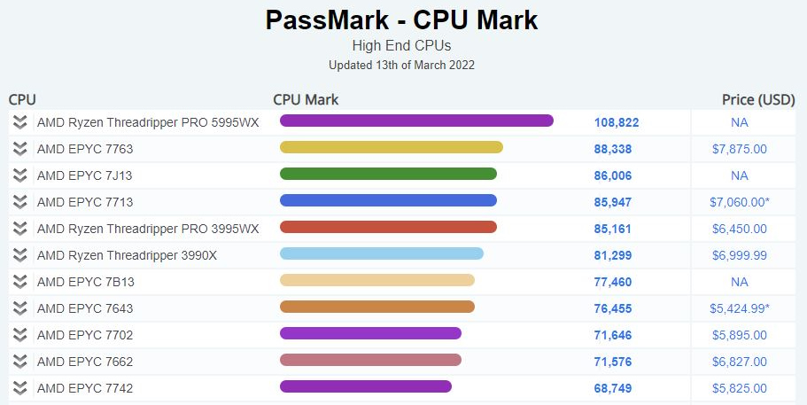 A Reddit user found out that PassMark updated the CPU Mark ranking with three AMD Ryzen Threadrippper 5000WX chips: the 5995WX, 5965WX and 5955WX. Currently, the flagship Ryzen Threadrippper 5000WX processor is at the top of the leaderboard with 108,822 points, beating everything else by at least 23%. To put things into perspective, the AMD EPYC 7763 is in second place with 88,338 points.