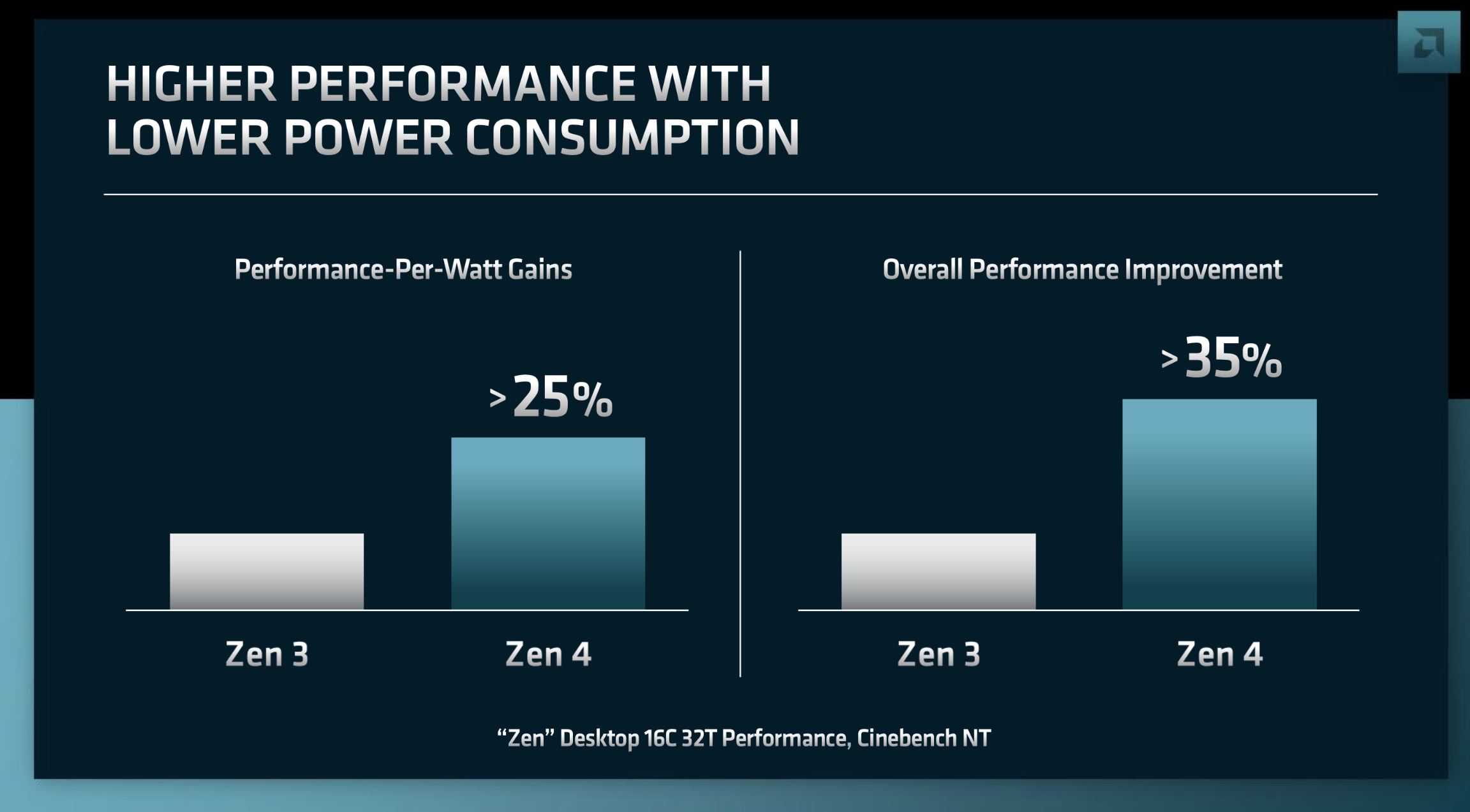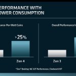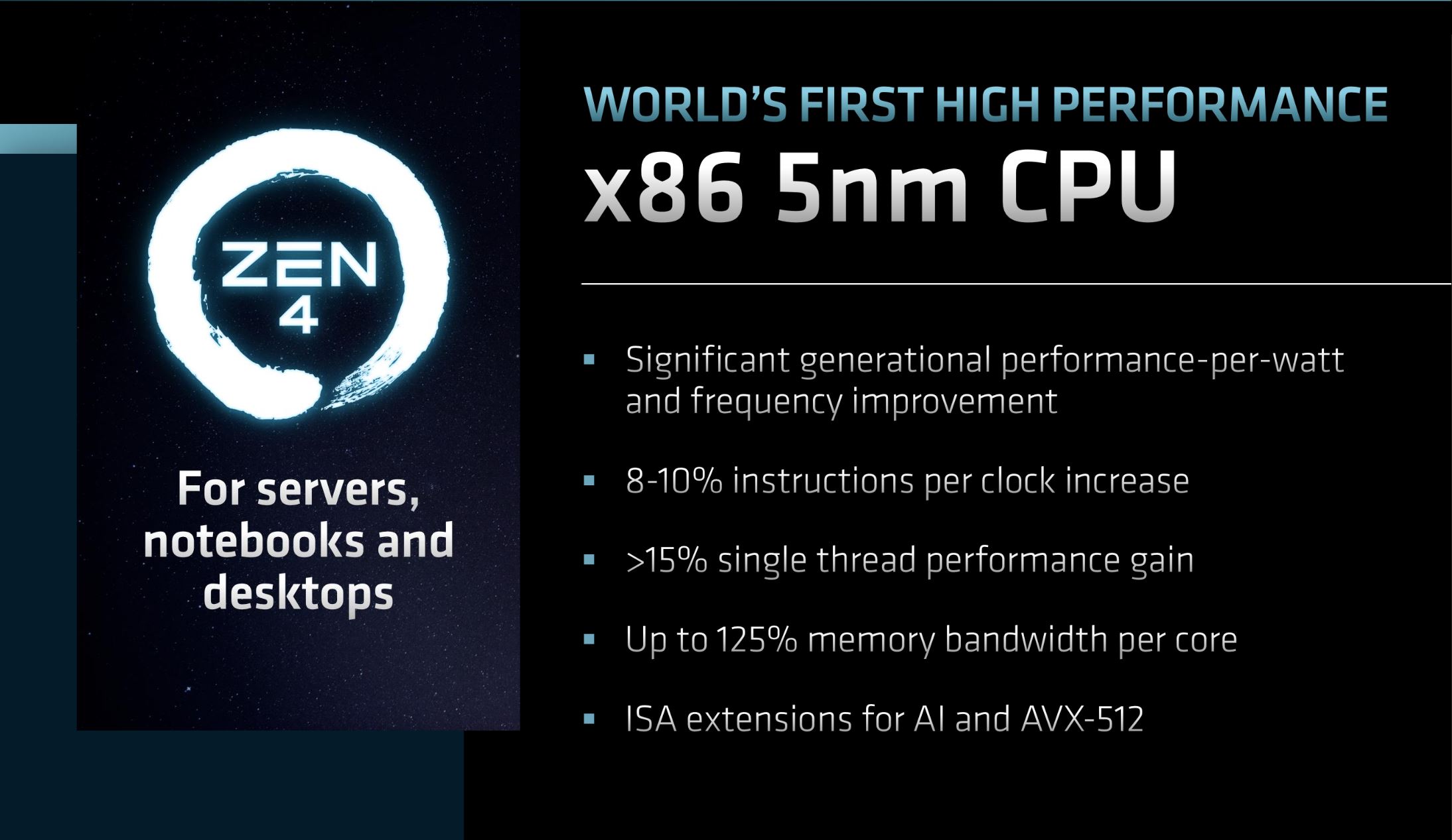 Compared to Zen 3, AMD claims Zen 4 offers an IPC boost of 8-10% and a single-thread performance improvement of over 15%. Moreover, bandwidth memory per core will increase, and the new chips will support ISA extensions for AI and the AVX-512 instruction set. These improvements result in a performance-per-watt gain of over 25% and an overall performance improvement of over 35% (based on the Cinebench multi-core test).