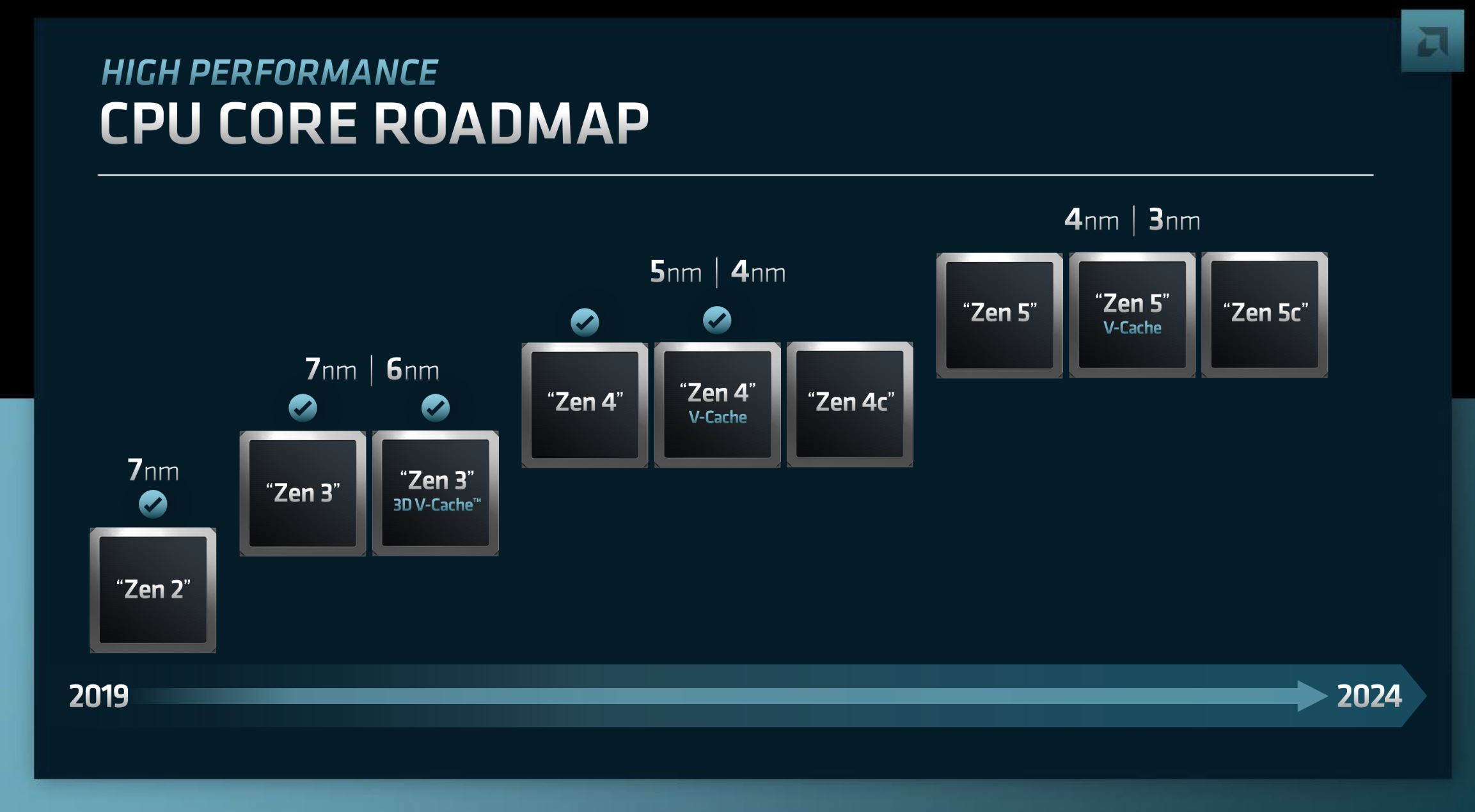 After Zen 4, we will get Zen 5 in 2024, which will also have V-Cache and “c” variants. All Zen 5 variants will be based on 4nm or 3nm nodes, bringing more performance and efficiency gains and improved AI and ML optimisations.