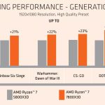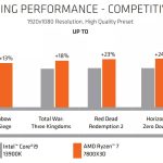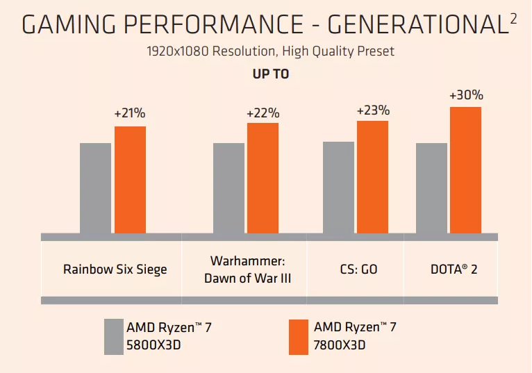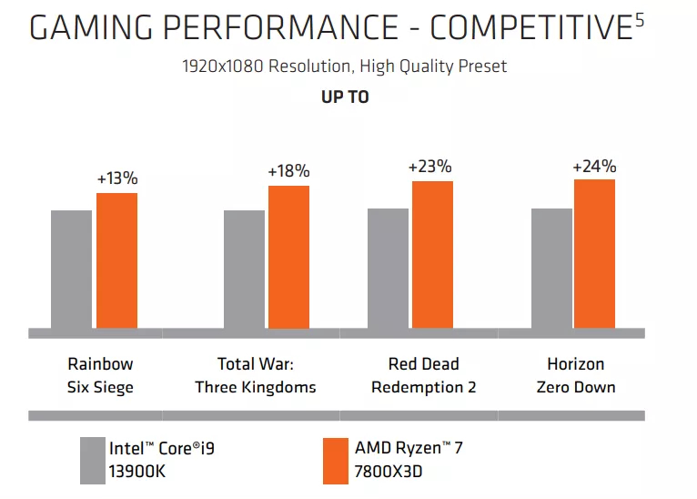 First compared with the Core i9-13900K, the upcoming processor was up to 13% faster in Rainbow Six Siege, up to 18% in Total War: Three Kingdoms, up to 23% in Red Dead Redemption 2, and up to 24% in Horizon Zero Dawn. On average, the AMD chip is up to 19.5% faster than Intel's CPU. Against the Ryzen 7 5800X3D, the performance differences increase, with the Ryzen 7000X3D chip being up to 21% faster in Rainbow Six Siege, up to 22% in Warhammer: Dawn of War III, up to 23% in CS:GO, and up to 30% in DOTA 2. That puts the upcoming processor as being up to 24% faster on average than the Ryzen 7 5800X3D.