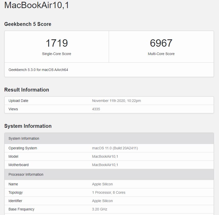 The Apple M1 Geekbench 5 benchmark, spotted on the Geekbench database, shows an incredible 1719 single-core score and a 6967 multi-core score. Comparing this to what is currently available, the single-core score is on par with a stock Ryzen 9 5950X, while the multi-core score is just above what is expected from a Ryzen 5 3600X.