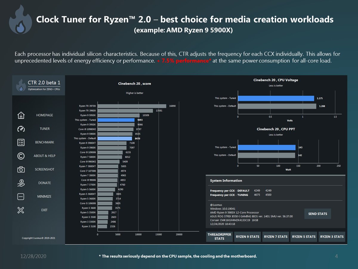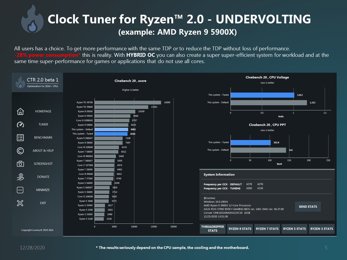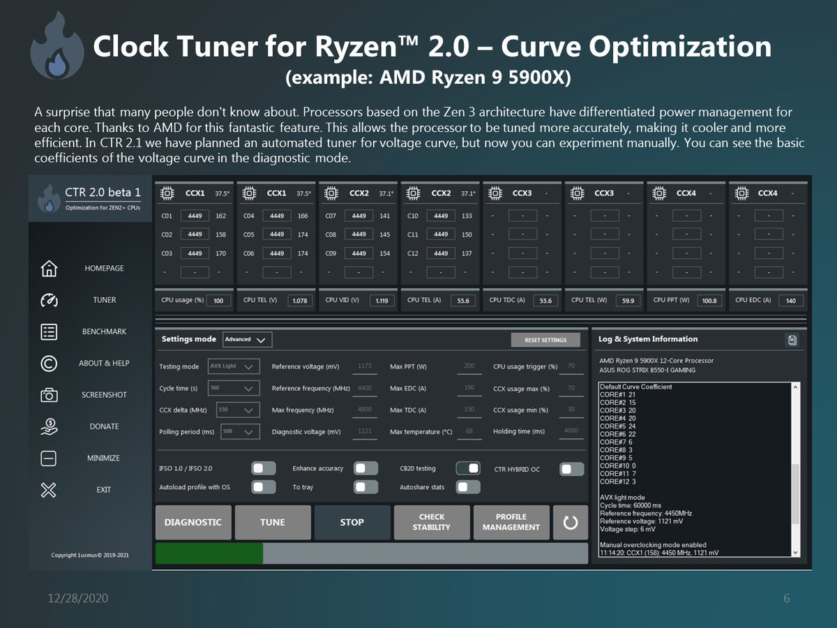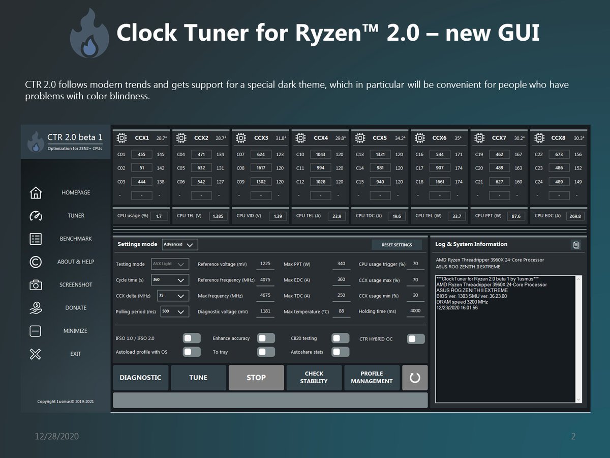 ClockTuner for Ryzen is getting a 2.0 version, updating its GUI with a new dark theme and introducing interesting new features such as the Hybrid OC mode and support for Ryzen 5000 series processors.