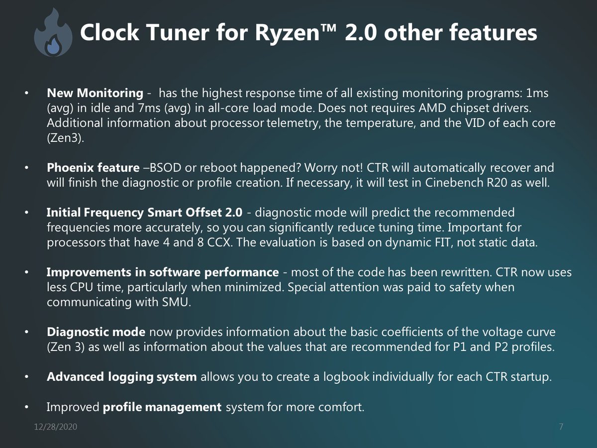 There are more features coming in version 2.1, including an automatic curve optimizer for Ryzen 5000 processors (manual mode already included), measurement mode, more optimisations for Ryzen 5000 CPUs, and Hybrid OC 2.0. The 2.1 version is expected to come at the end of the first quarter of 2021. CTR 2.2 will come in the third quarter of 2021, bringing support for Threadripper Genesis (5000 series) and Ryzen Cezanne APUs.