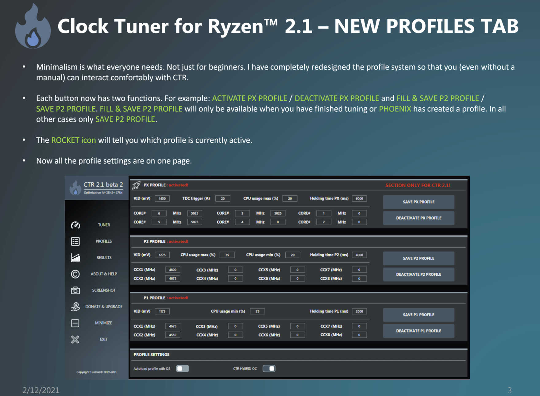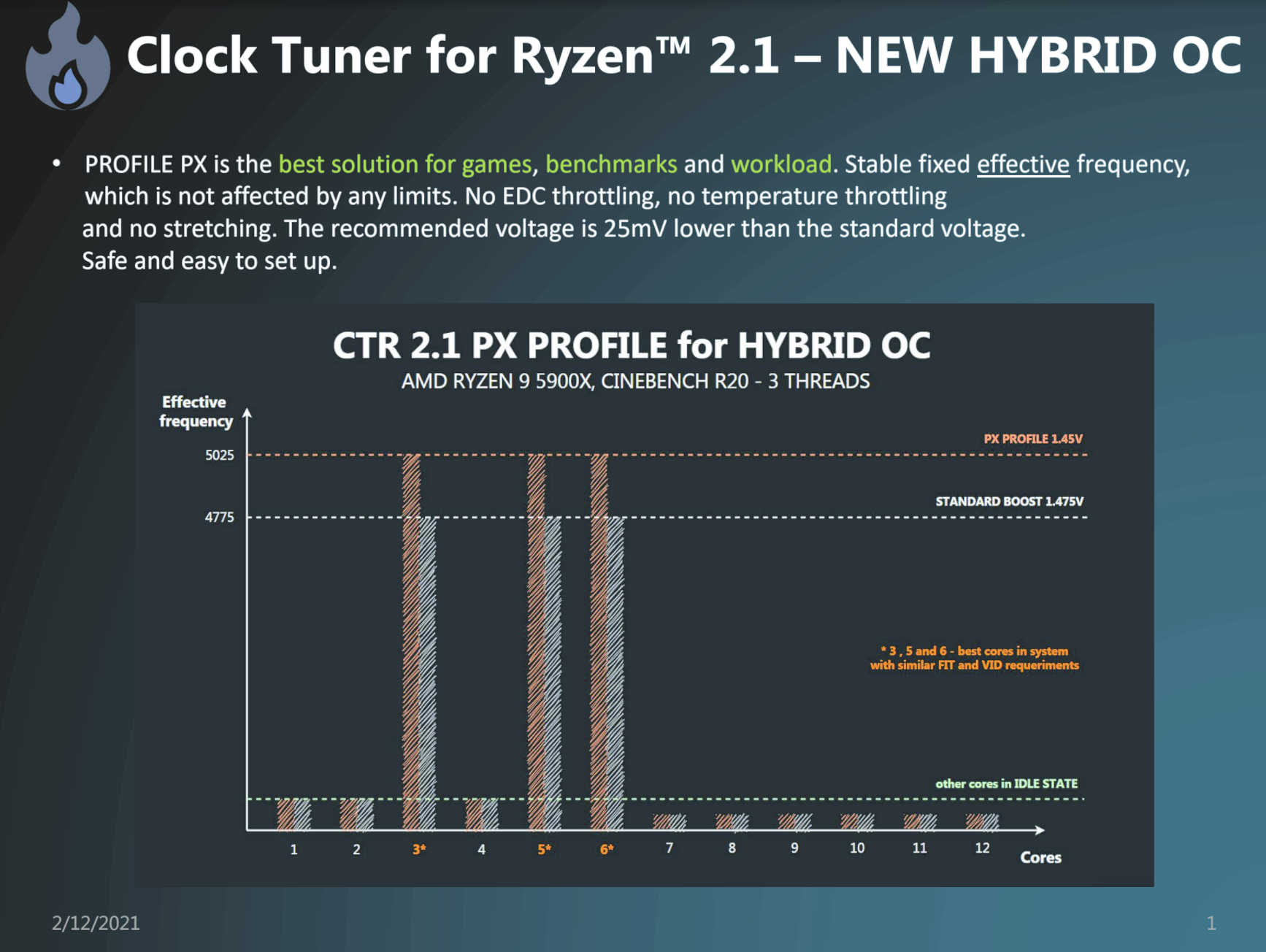 Besides the P1 and P2 profile, CTR 2.1 will also bring a PX profile. As per 1usmus, this is the best solution for games, benchmarks, and any other workload. The PX profile has a stable fixed frequency, not affected by any limit, meaning that it won't suffer from EDC or temperature throttling. The recommended voltage for this profile should be 25mV less than the default voltage.