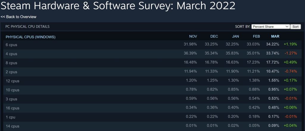 As expected, Steam released the hardware and software survey results for March this week. According to the data, 34.22% of the systems sharing their data with Valve have a 6-core CPU, a 1.19% increase over February. Meanwhile, the number of quad-core CPUs declined, dropping to 33.74%. Lastly, 8-core chips are in third place with 17.72%, a 0.49% increase over the previous month.