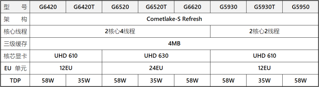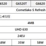 The next-gen Pentium and Celeron SKUs will also be based on Comet Lake-S, and consist of 8 SKUs. Starting with the G5930 (58W), G5930T (35W), and G5950 (58W) processors, these will come with a 2C/2T configuration, 4MB of cache, and UHD 610 iGPU with 12EUs. The G6420 (58W), G6420T (35W), G6520 (58W), G6520T (35W), and G6620 (58W) processors are equipped with 2 cores, 4 threads, and 4MB of cache. The G65xx and G6620 come with a UHD 630 iGPU with 24EUs, while the G64xx have a UHD 610 iGPU with 12EUs. Operating frequencies were not shared, but a 100-200MHz bump is expected.