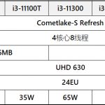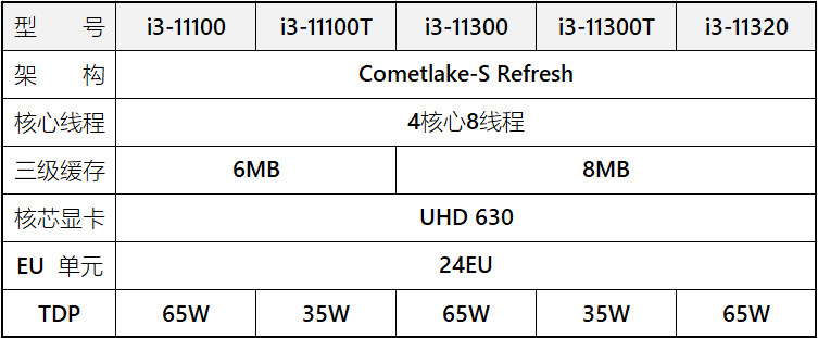 Jumping on to the i3 processors' lineup, it will consist of 5 Comet Lake-S refreshed SKUs: 11100, 11100T, 11300, 11300T, and 11320. The “non-K” processors also come with 65W TDP, while the “T” ones have a 35W TDP. All have 4 cores, 8 threads, UHD 630 iGPU with 24 EUs, and 8MB of cache, except the 11100 and 11100T CPUs which have 6MB of cache. Although we don't know the exact clock frequencies, the source claims that it's expected that it comes with a bump of 200-300MHz compared to the 10th Gen Core processors.