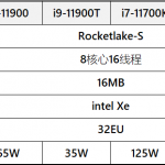 The Core i9 series will consist of the 11900K, 11900, and 11900T SKUs. Similar to the i9 series, the i7 series will have also have three SKUs: 11700K, 11700, and 11700T. All i7 and i9 processors will feature 8 cores and 16 threads, 16MB of cache, Intel Xe-LP iGPU with 32EUs, and 125W (K), 65W (non-K), and 35W (T) TDPs.