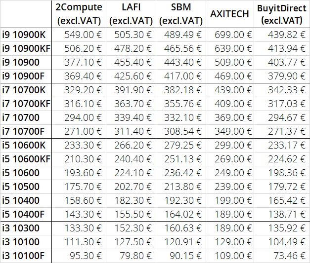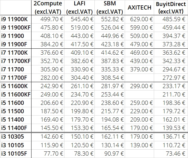 Initially shared by @momomo_us, the list of prices of the 11th Gen Core processors from Belgian retailer 2compute show us that while some SKUs of Intel's next generation of CPUs will be more expensive than their 10th generation counterparts, others will not. Taking the Core i9-11900K as a reference, when compared to the 10th Gen Core series flagship, the Core i-9 10900K is about 10% more expensive, but on the other hand, the 10th Gen Core-i7 line-up seems to be cheaper than the 11th generation Core-i7 CPUs.