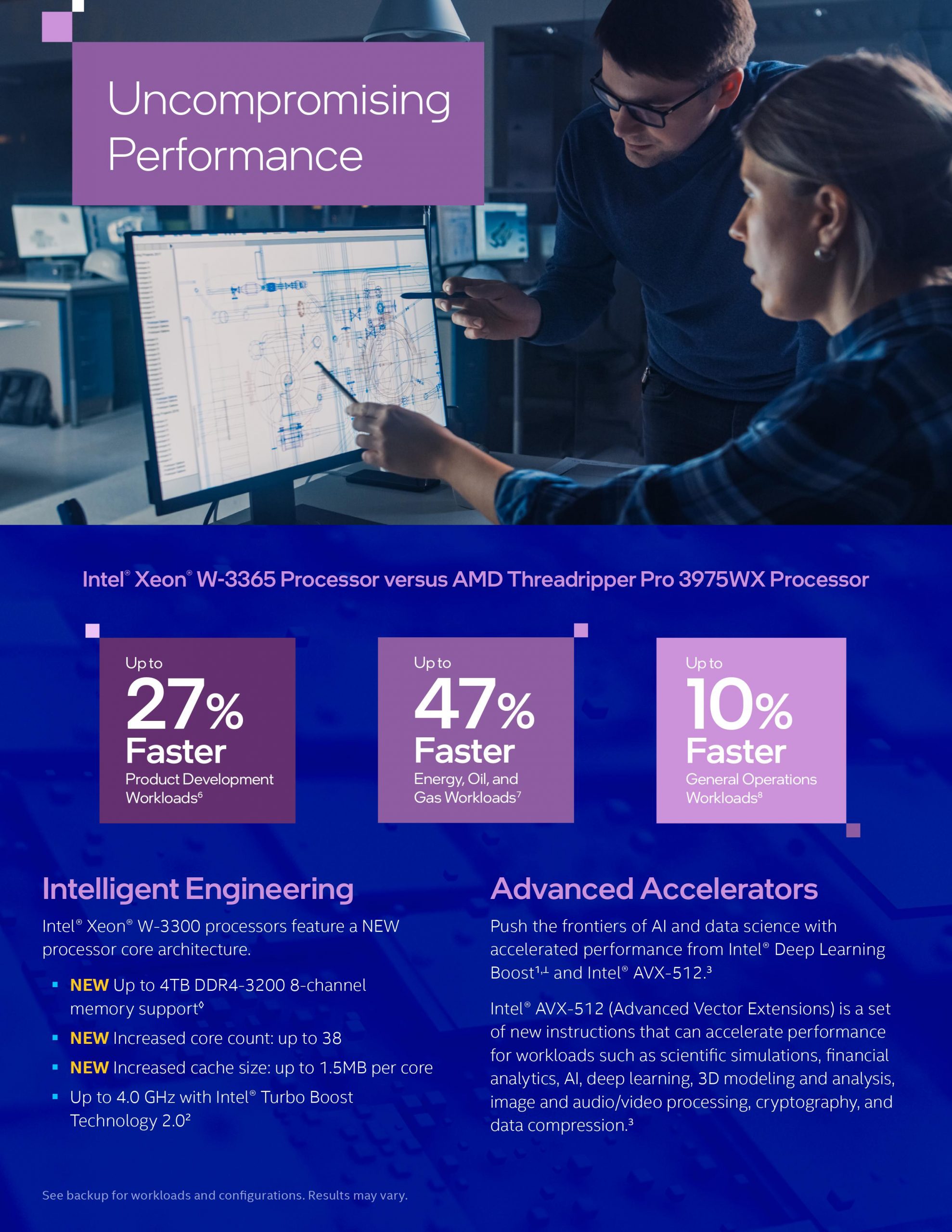 Compared to its predecessor, the Xeon W-3375 CPU is up to 26% faster in previewing rendering in AutoDesk Maya, up to 20% faster in Adobe Premiere Pro workloads, and up to 45% faster on the Cinebench R23 multi-thread benchmark. Now comparing the Xeon W-3365 processor with the AMD Threadripper Pro 3975WX, the former is 27% faster in product development, up to 47% faster in energy, oil, and gas workloads, and up to 10% faster in general workloads.