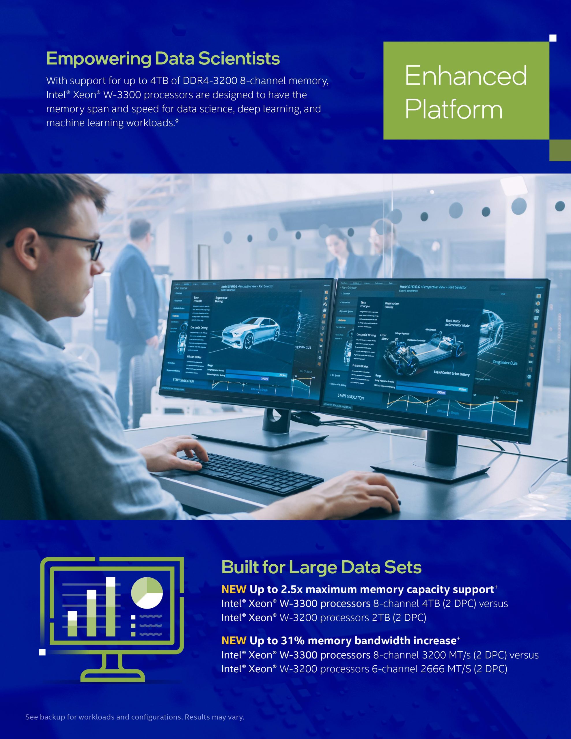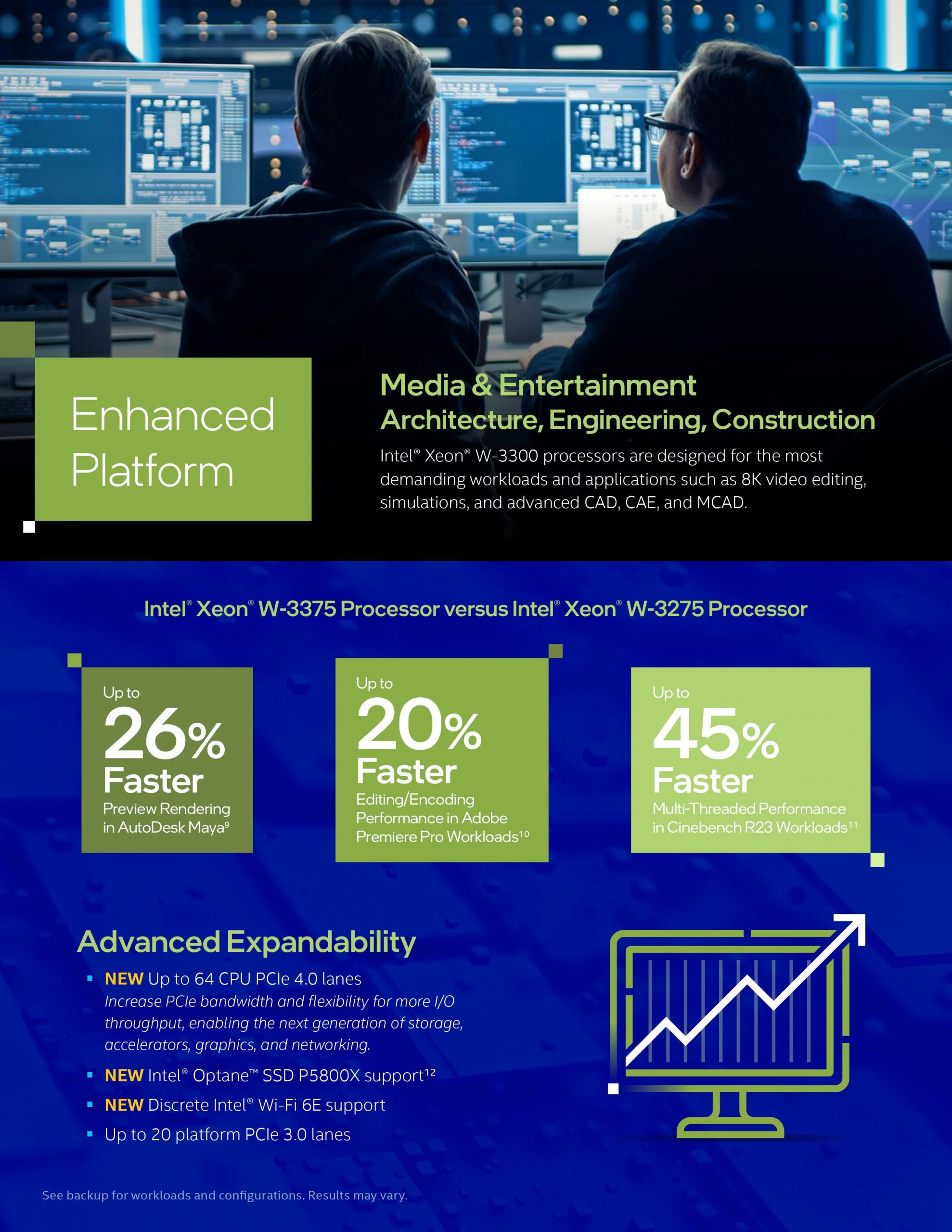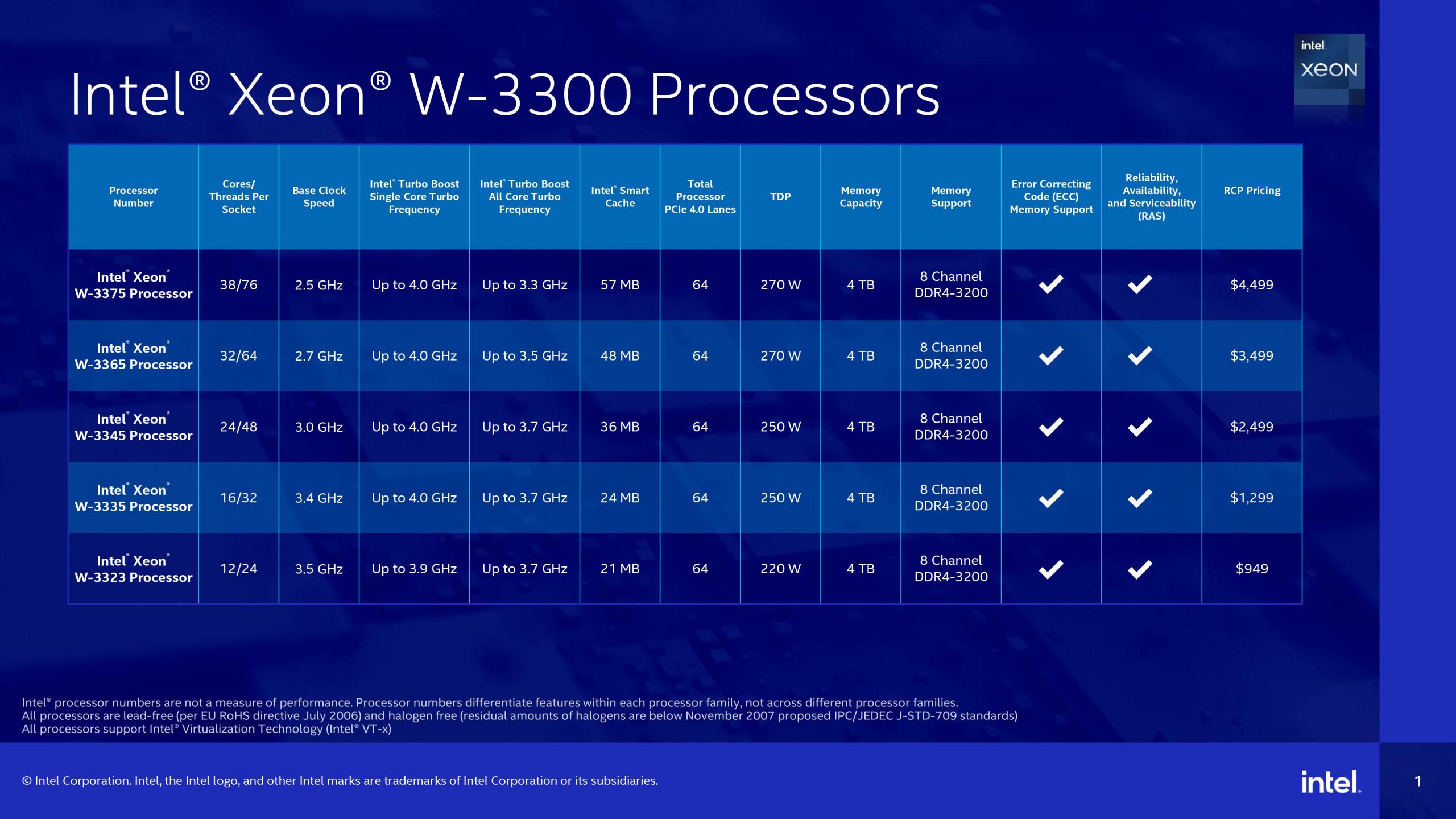 The Intel Xeon W-3300 processors were built for heavily threaded applications with I/O-intensive workloads, including AI, architecture, engineering, construction and media. The Intel Xeon W-3300 series comes with five new SKUs – W-3323, W-3335, W-3345, W-3365 and W-3375. All of them support Intel Deep Learning Boost, AVX-512 instruction set, RAS technologies, Wi-Fi 6E, and up to 4TB of DDR4-3200 ECC memory. Each of these processors also have 64 PCIe 4.0 lanes.