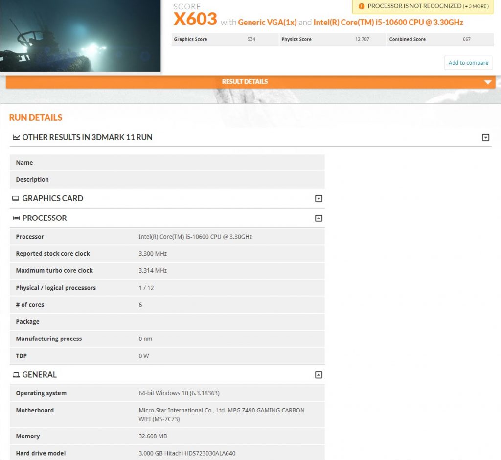 Following yesterday's leak, a new listing of a Comet Lake processor has appeared in 3DMark's database. This listing shows a Core i5-10600, detailing some of its specifications, and new Z490 motherboard, the MSI Z490 Gaming Carbon.