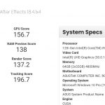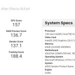There were three entries on PugetBench, each with a different overall Adobe After Effects benchmark score: 1541, 1573, and 1575. It's worth noting that this benchmark is not suited to test CPU performance, but these scores were the only ones found on the list.