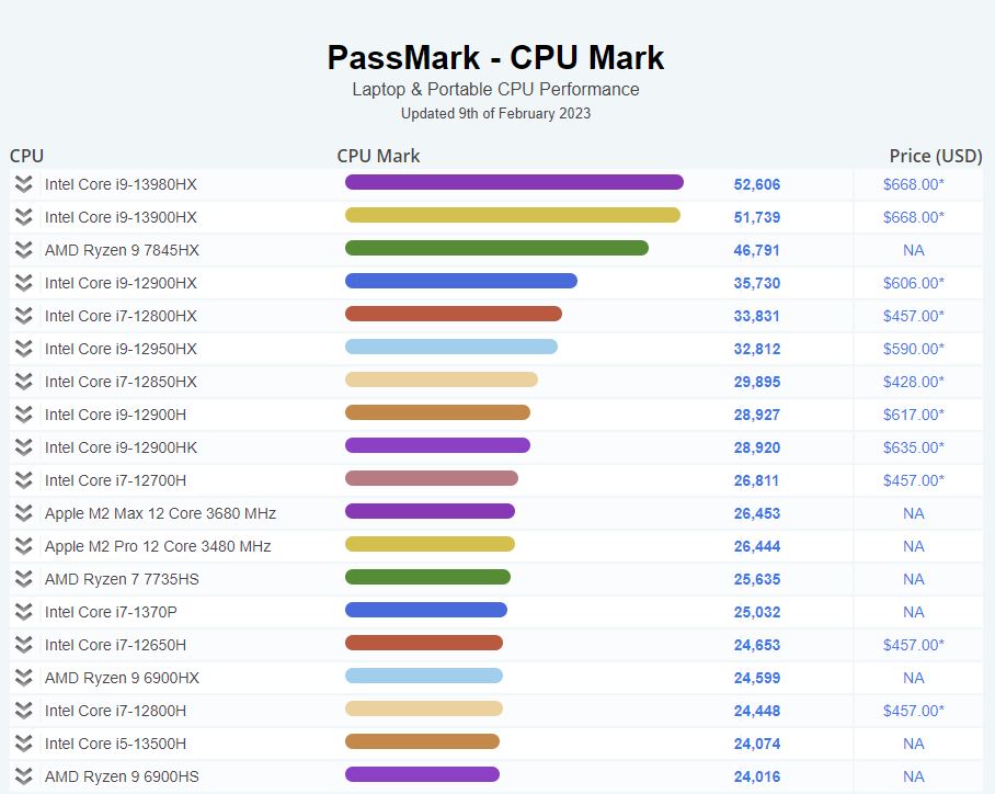 Whether we're talking about single-core or multi-core performance on a laptop platform, it seems we have a new reigning champion. The first Core i9-13980HX entries have started to be submitted into PassMark's database, and in both rankings, the upcoming Intel flagship mobile CPU is the new leader.
