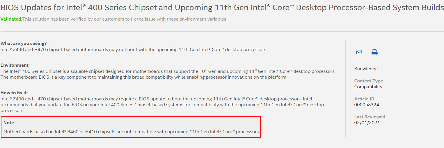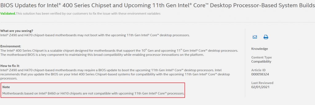 This information came from Intel itself, on a support page to help people that may not be able to boot the system when using a Z490 or H470 motherboard paired with an upcoming 11th Gen Core processor. On this page, there's a note stating that “motherboards based on Intel B460 or H410 chipsets are not compatible with upcoming 11th Gen Intel Core processors.”