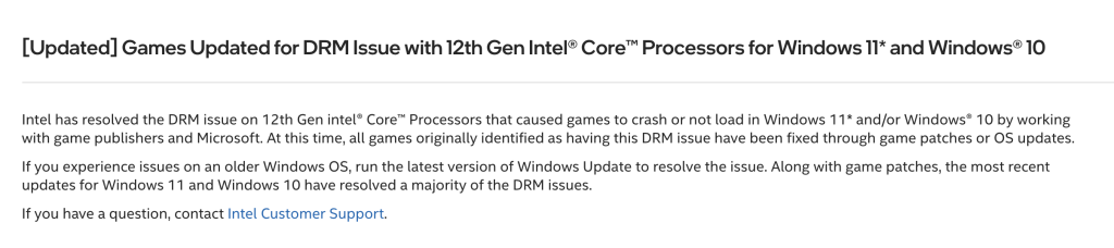If you have a 12th Gen Core-based system and you're still finding these errors in titles using DRM services, try to update the game to the latest version, as well as your Windows OS. If that doesn't solve your issue, Intel recommends contacting customer support. After all, it is possible some games are still out there that were never included on the list of games recognized to have DRM issues.