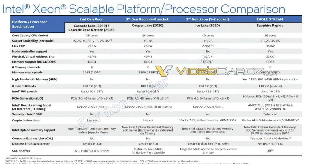 Based on Intel's 10nm Enhanced SuperFin node, the Sapphire Rapids processors are expected to feature up to 56 cores, a maximum TDP of 350W, and can be used simultaneously at up to 8x sockets. Sapphire Rapids CPUs will support up to 8x channels of DDR5-4800 memory and up to 80x PCIe lanes (PCIe 5.0 and 4.0).