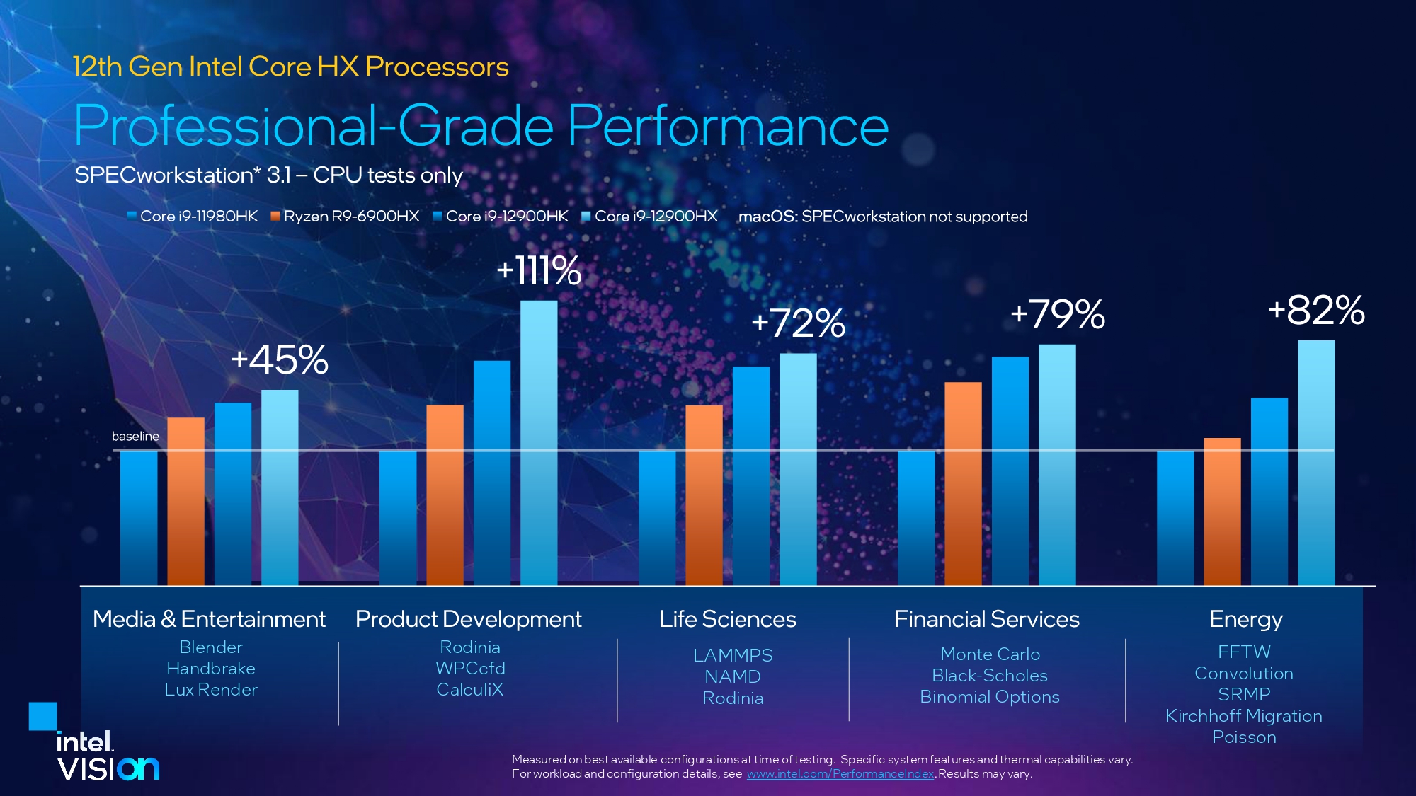 Based on Intel's benchmarks, performance will be significantly superior to the i9-11980HK. The new flagship CPU (i9-12900HX) will be 45% faster in media and entertainment workloads. Product development is the field where the new processors will shine brightest, offering +111% performance compared to the older i9 chip. As for life sciences, financial services and energy workloads, performance improvement over the 11th Gen Core i9 chip ranges between 72% and 82%. Performance should also be better in gaming, but don't expect any three-digit gains.