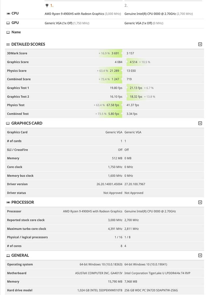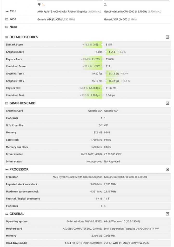 The integrated GPU on the listed Tiger Lake processor is based on the new Xe Graphics architecture designed by Intel. On the other side, AMD is using its Vega architecture on the integrated graphics of the Ryzen 9 4900HS. As seen in the image below, the Xe iGPU from Intel is outperforming AMD's Vega by about 10.5% in the “Graphics Score”. Further below, in both “Graphics Test 1” and “Graphics Test 2”, Intel Xe beats AMD Vega by 6.7% and 13.8%, respectively. Unfortunately, the integrated graphics clocks weren't registered.