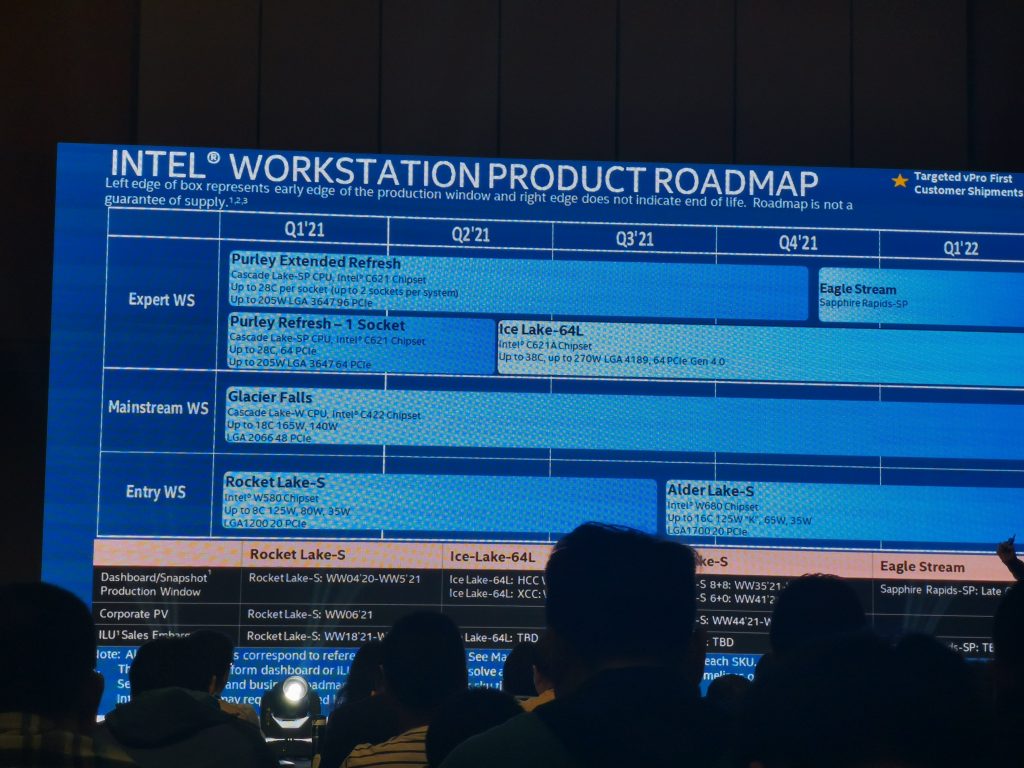 The roadmap leaked by @9550pro refers to Intel workstation products. Divided into “Expert WS”, “Mainstream WS”, and “Entry WS”, the roadmap hints at a release of the Alder Lake workstation platform in Q3 2021. The platform seems to feature the Intel W680 chipset, 125W (K processors), 65W, and 35W processors with up to 16 cores, 20 PCIe lanes, and the LGA1700 socket.