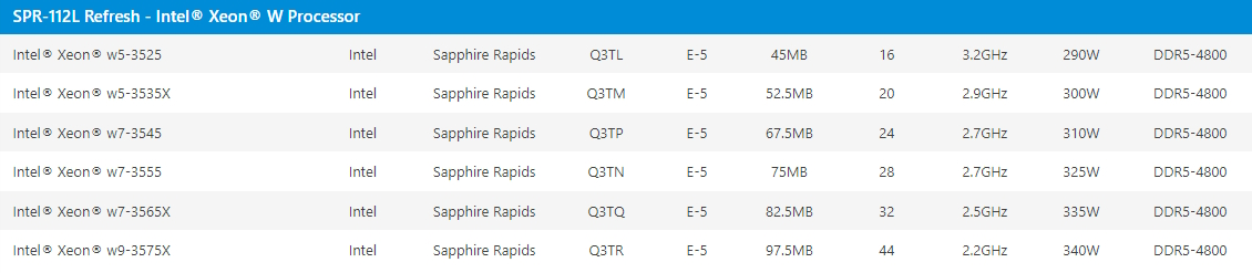 One notable omission from the leak is the top-tier SKU, but we have information on the Xeon W9-3595X, which will be Intel's first Xeon High-End Desktop (HEDT) SKU with 60 cores. This SKU will have the same 350W TDP as the W3495X, with lower base and turbo clock speeds.