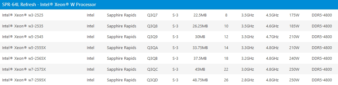 Recent leaks by @momomo_us have provided specifications for the upcoming Xeon W3500 and W2500 series processors, which are part of Intel's Sapphire Rapids refresh. Compared to the previous W3400 processors, the W3500 series will feature at least four more cores and a larger L3 cache. Although the base and boost clock specifications seem to be lowered, none of the models are anticipated to exceed 350W TDP.