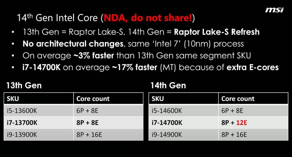 This slide confirms that there will be no significant core count increases in Intel's 14th Generation Core series. Only one of the future K-series CPUs will have a bump in the core count compared to its predecessor, and that's the Core i7-14700K. The number of P-cores will remain at eight, but it will bump the E-core count from eight to twelve. MSI's presentation also confirms that the Core i9-14900K will employ the same 8P+16E configuration. This also applies to the Core i5-14600K with the 6P+8E configuration.