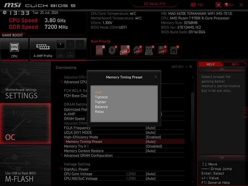 Then there's MSI's High-Efficiency Mode, which optimises memory settings to minimise latency and elevate performance in specific applications. With four presets (Tightest, Tighter, Balance, and Relax), users can select the most suitable setting based on their memory's overclocking capabilities.