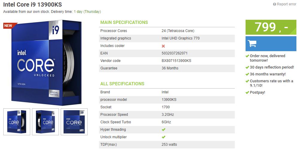 VideoCardz has found out that both French retailer LDLC and Dutch retailer Megekko (archive) have already listed the Intel Core i9-13900KS processor ahead of release. At the french retailer, the CPU was available for €949.96, quite expensive compared to the Core i9-13900K at other European retailers, but within the prices sold at the same store (the Core i9-12900KS costs €919.96).